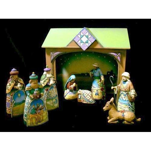 Jim Shore 10 Pc Nativity Set W/ Creche - THIS SET REPLACES 20-0000402 - 10 Pieces (includes the Creche) Creche (7.75"), Mary (3"), Joseph (4.5"), Jesus (1.5"), Three Kings (4.5"), Shepherd (4"), Lamb (1.25"), and Donkey (2.25") By artist Jim Shore, this beautiful resin Nativity Set makes a perfect seasonal table decor item. Highly detailed, this set features colorful patterns, with a handcrafted 'distressed' look. It makes a wonderful gift. This beautiful nativity scene from beloved folk artist Jim Shore is BRAND NEW FOR 2007. Stable measures 7.75" tall. Tallest figurine measures 4.5". Please note that the Jim Shore figurines are made of resin. The Creche is made of wood. The resin figurines are made to look like they were carved out of old wood. The striations (or lines) that appear to be cracks are not really cracks or imperfections but are made that way on purpose to make the pieces have a rustic, old vintage look of carved wood. No two pieces are exactly alike as each piece is carefully hand painted.
