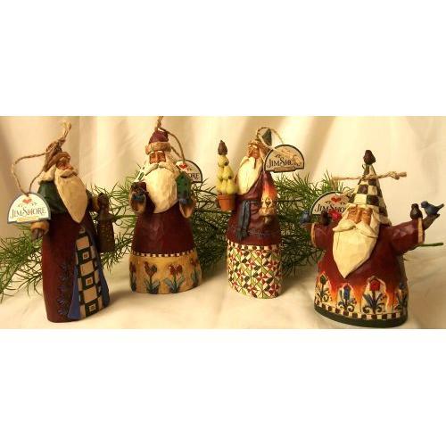 Jim Shore LARGE SANTA Hanging Ornaments SET/4 - Wood look ornaments by artist Jim Shore, these beautiful hanging Santa ornaments lend festivity and joy to your holiday season. Each ornament hangs by jute rope and features a handcrafted wood look. Stone resin, measures 5" - 6" tall. Come in attractive gift box.