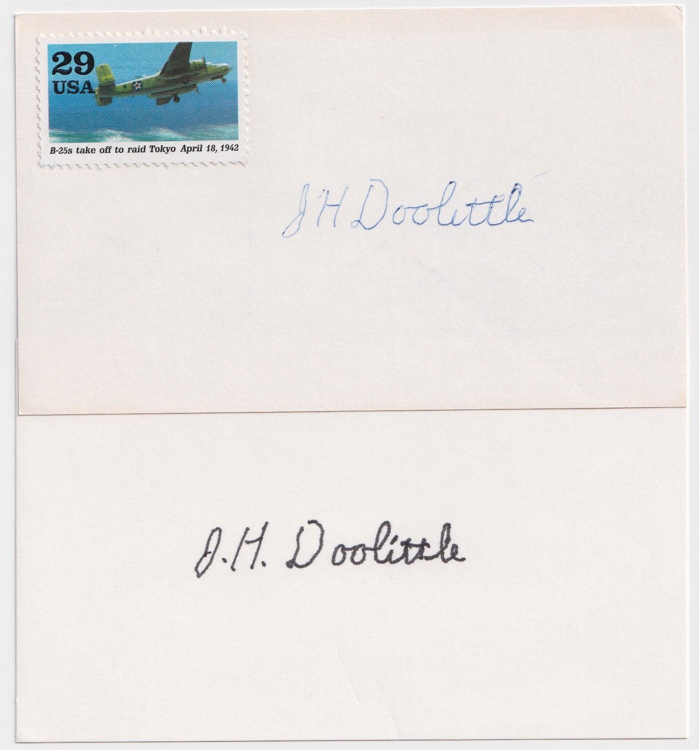 (1896-1993) was an American military general and aviation pioneer who received the Medal of Honor for his daring raid on Japan during World War II. Two signed index cards, one with B-25 postal stamp, 3 x 5 inches.