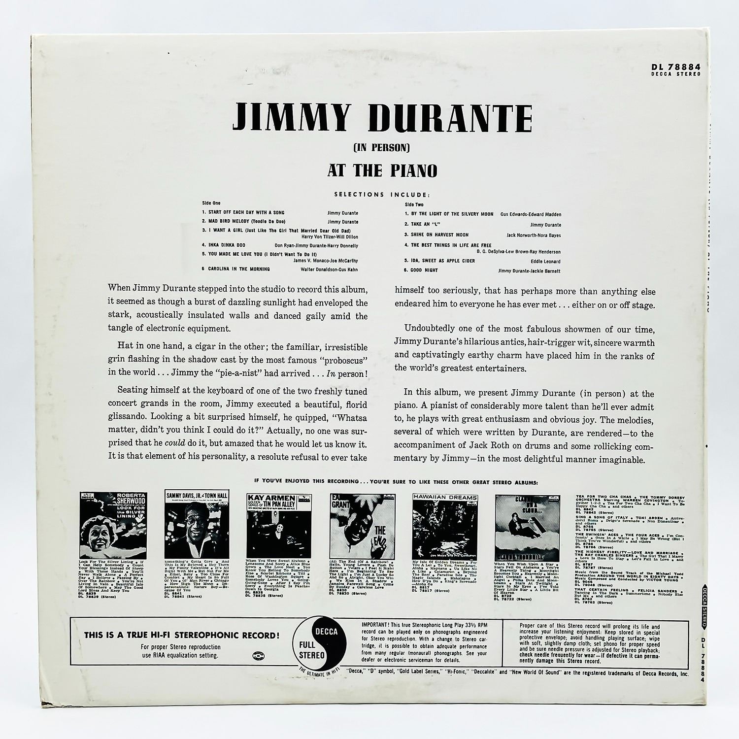 #8681 - TV / MOVIE ACTOR AND COMEDIAN JIMMY DURANTE, VINYL LP RECORD ALBUM, JAZZ, POP, MUSIC HALL, VOCAL, DECCA RECORDS DL 78884