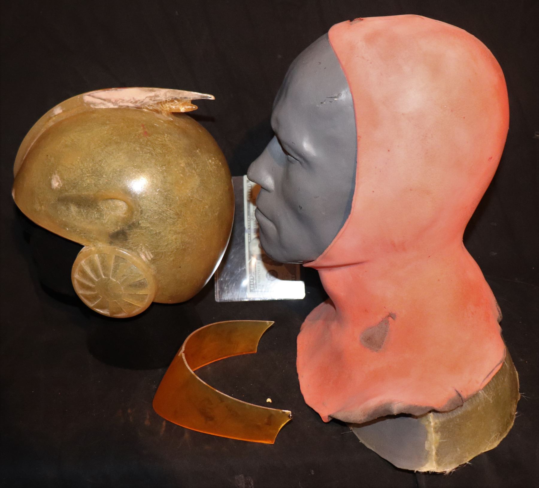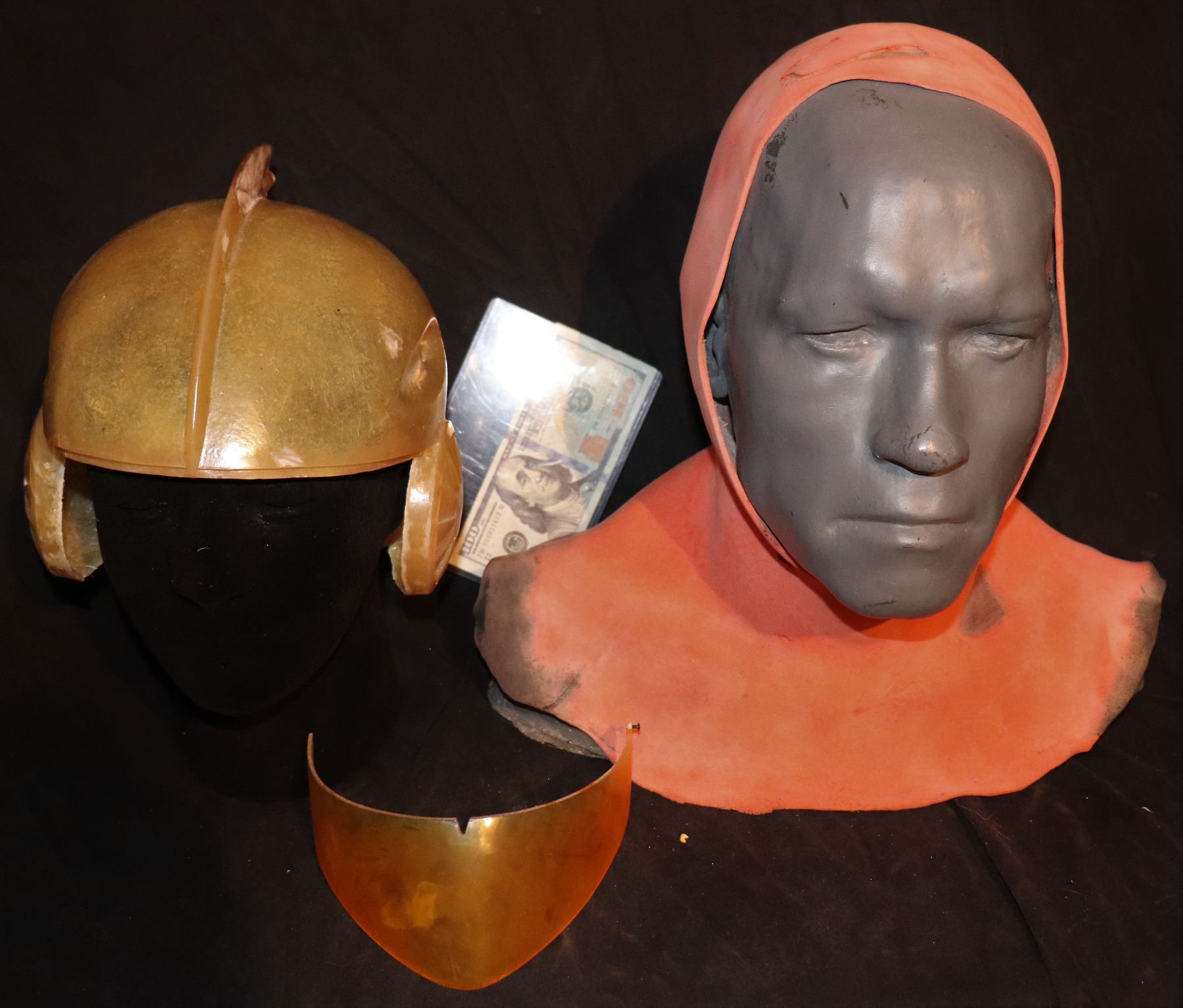 Unused Production Castings. Includes the Fiberglass Helmet, the Acrylic Visor, and the Foam Rubber Cowl on a full Fiberglass Bust of ARNOLD SCHWARZENEGGER.