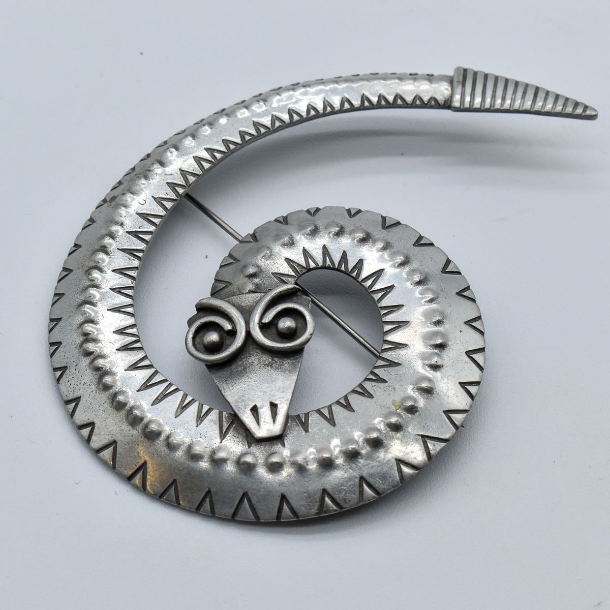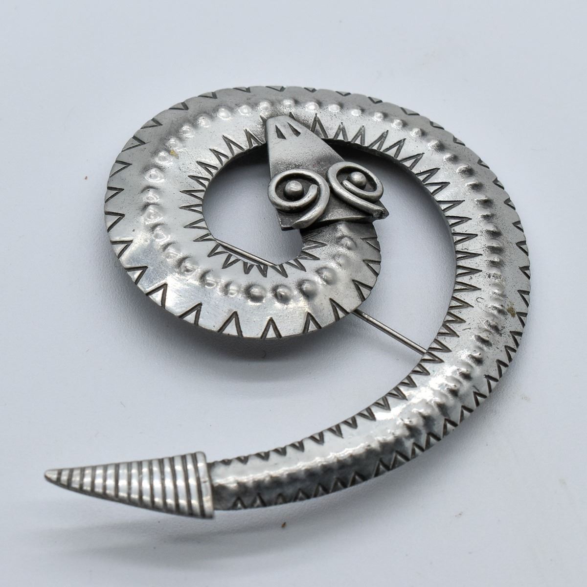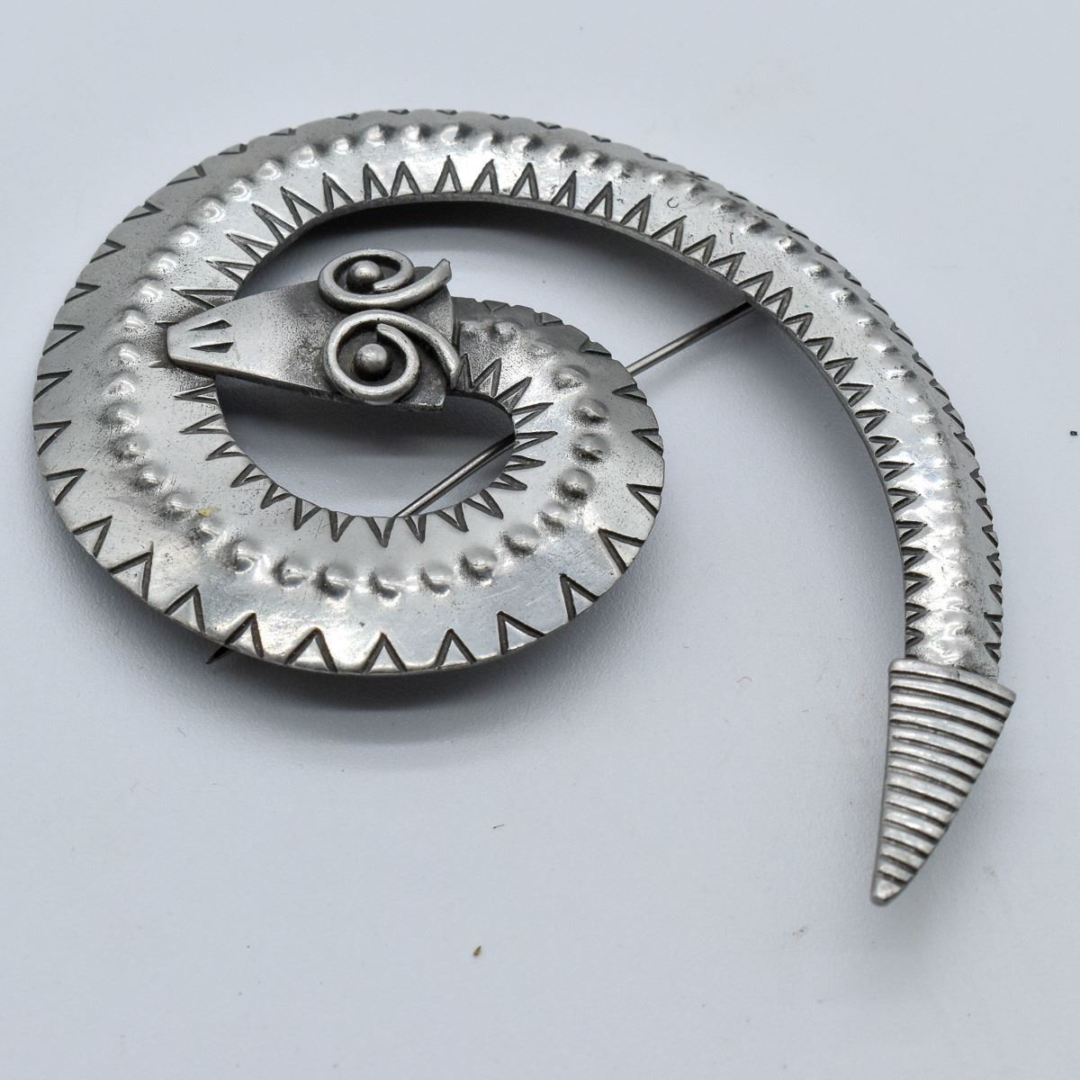JJ Pewter Rattlesnake Pin, measures 2.5'' x 4'' and is hallmarked on the back
