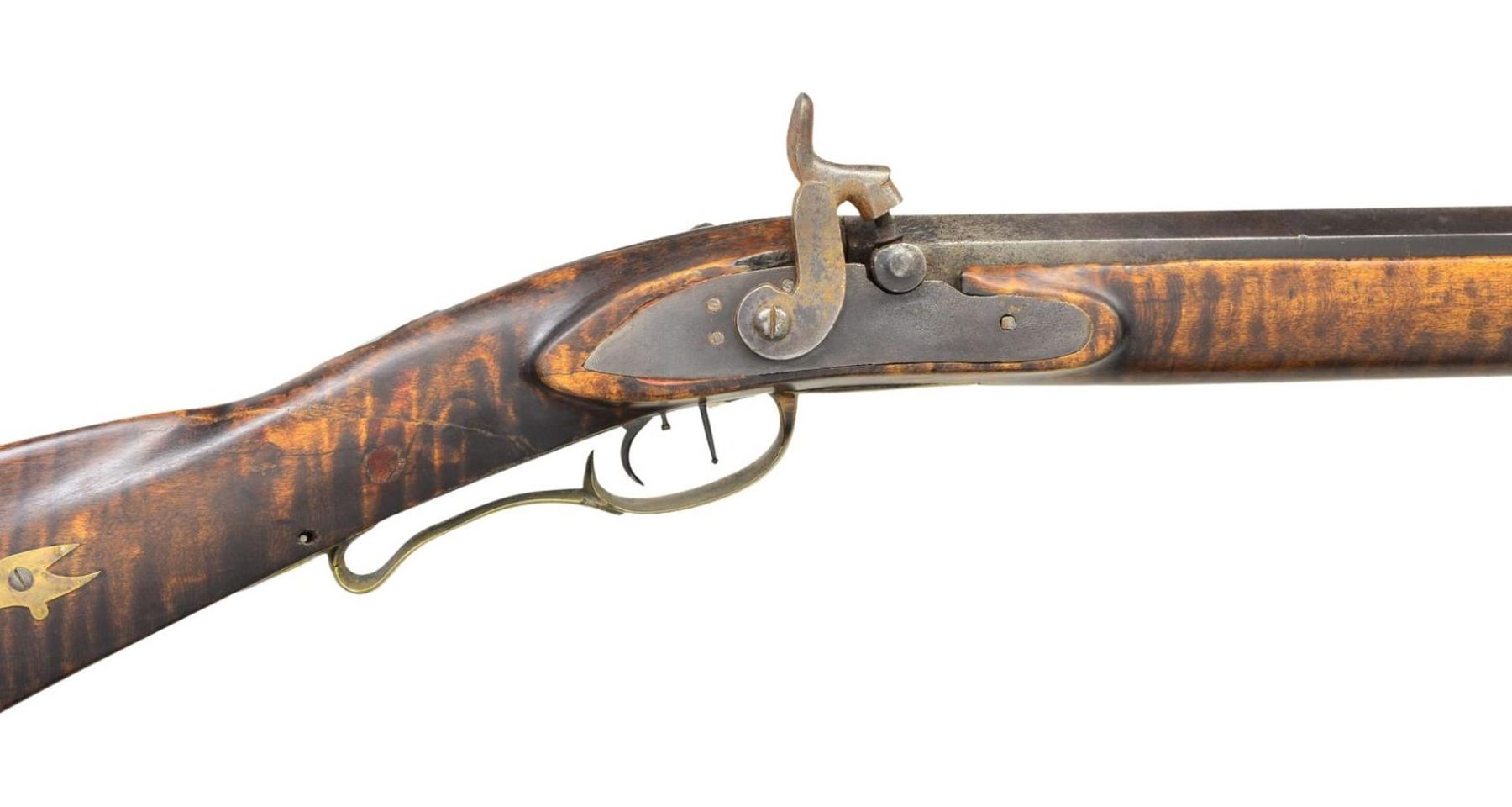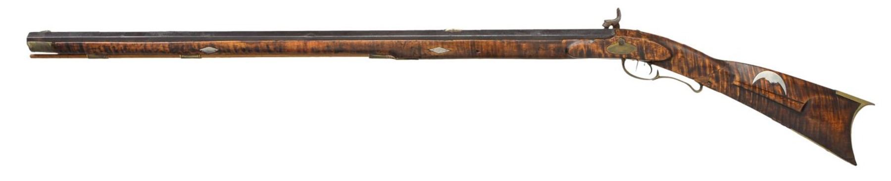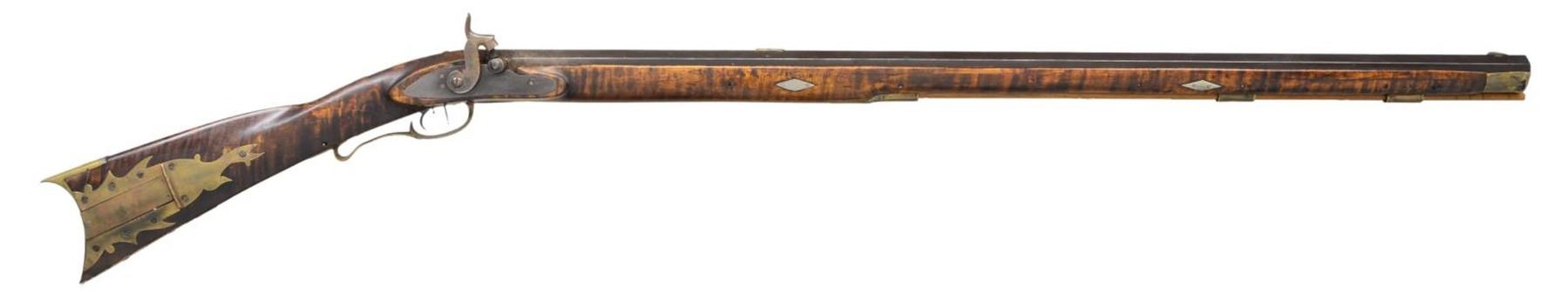 Cal. 50. NSN. The octagon 35 1/2" barrel has a German silver blade front sight and a large brass dovetailed base for the rear sight; the rear sight is broken off and missing. Bolster-style breech. Double-set triggers: front is straight and rear conventional is set. Full-length wedge-fastened maple stock with brass patchbox, finger-curl trigger guard, and crescent buttplate. German silver ornamentation includes four diamonds on the forearm, a diamond on the wrist, and a man in the moon on the cheekpiece. Hardwood ramrod is held by two brass pipes and a thimble. CONDITION: barrel & lock have a brown patina appearance mixed with pitting and corrosion, with several noticeable impact dents on the barrel. Stock has a repaired break through the wrist using glue, two wood splices, and two dowel plugs. Wood has been sanded and lightly refinished with a crack and filler around the lock, wood repair at the toe, a crack below the sideplate, wood splice on the left side barrel channel forward of the side plate, and large cracks extending from the nosecap. Brass acquired a mustard patina with small dents and verdigris throughout. Bore has strong rifling, showing pitting throughout. (01-24335/MD). ANTIQUE. $500-700.