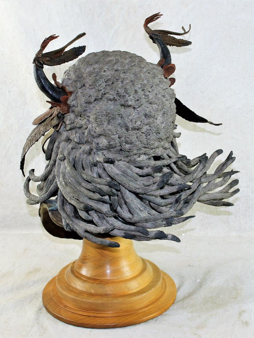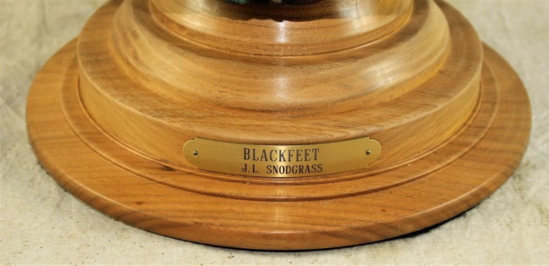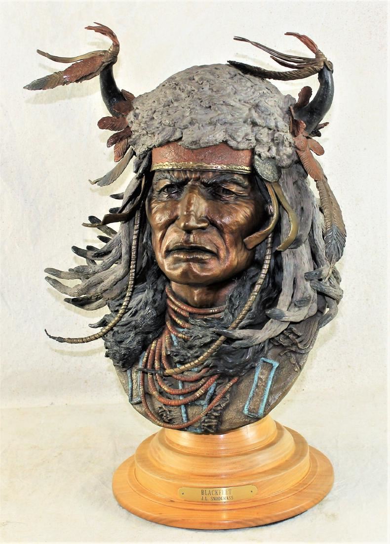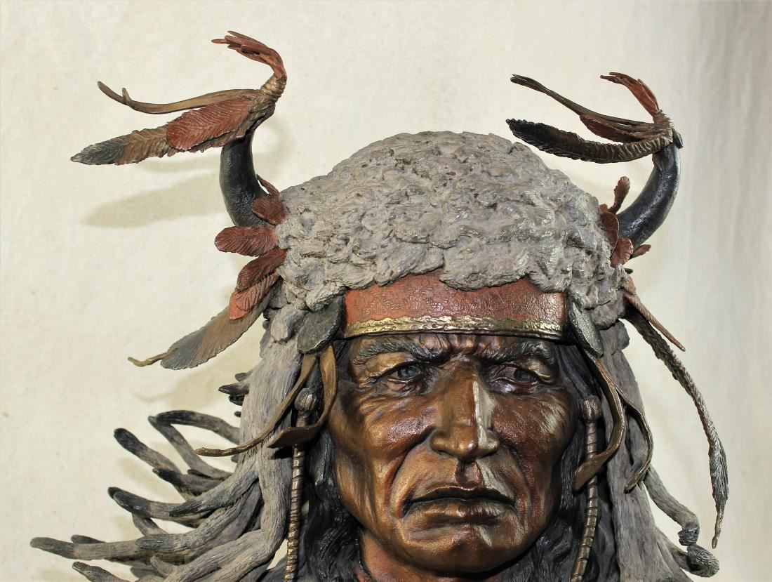 Striking large bronze bust titled, "Black Feet", on wood base, showing great color and presence. Measuring 21" in height.