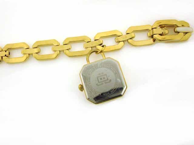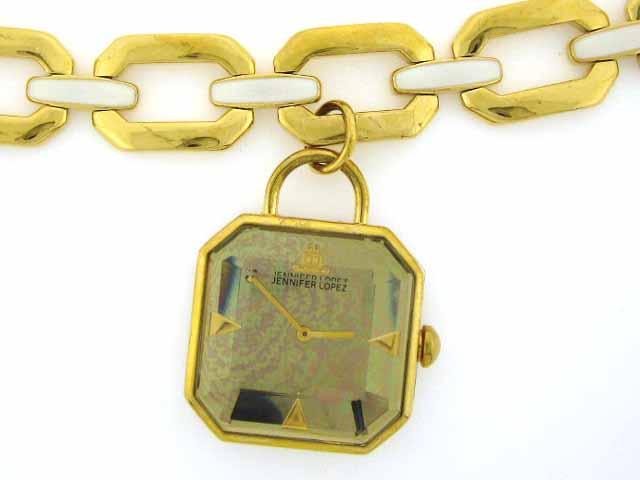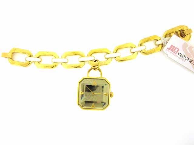 This is a JLO Watch with Gold Tone Charm Style. The watch has a Stainless Steel Back with Japan Quartz Movement. The bezel is Base Metal.