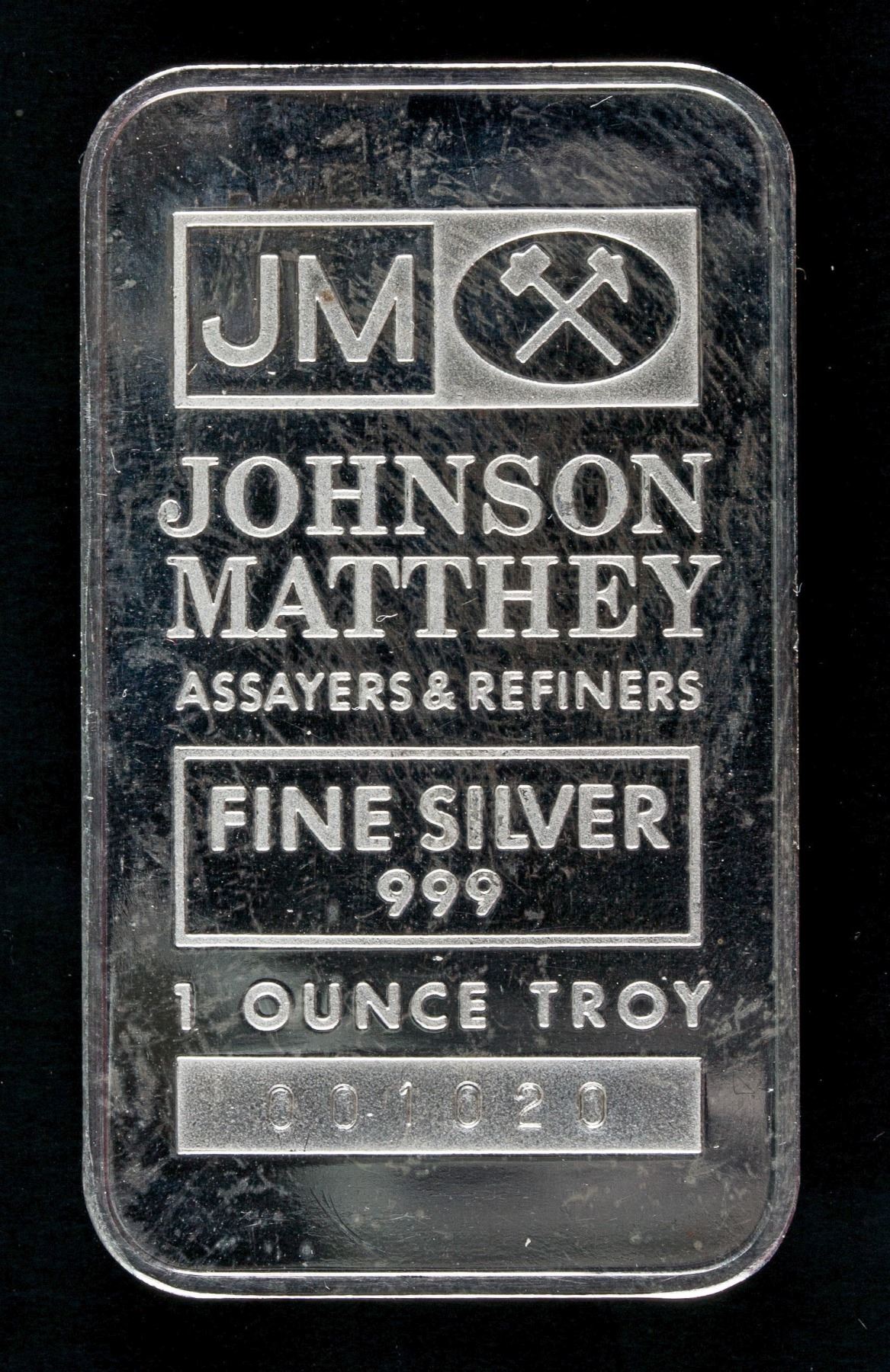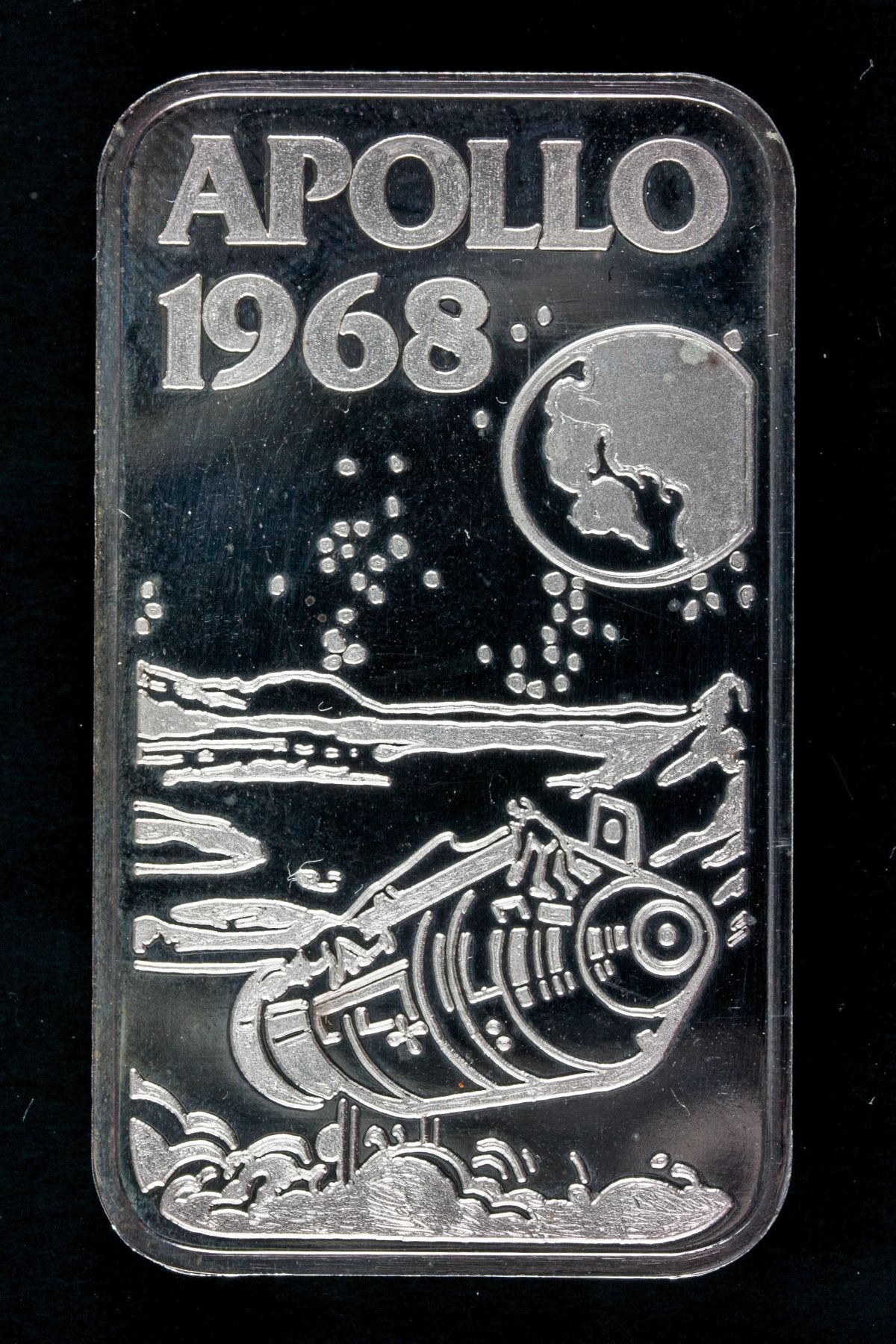 Very rare1 troy ounce JM Johnson silver art bar; the reverse marked JM, Johnson Matthey assayers & refiners, obverse featuring Apollo 19,1968; serial number: 001020; 31.451 grams, L: 5 cm, W: 2.9 cm