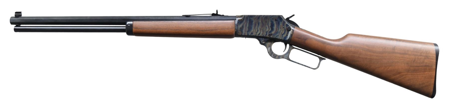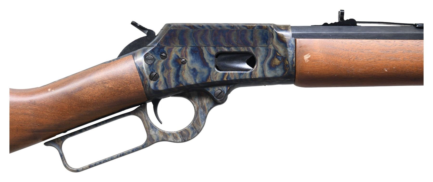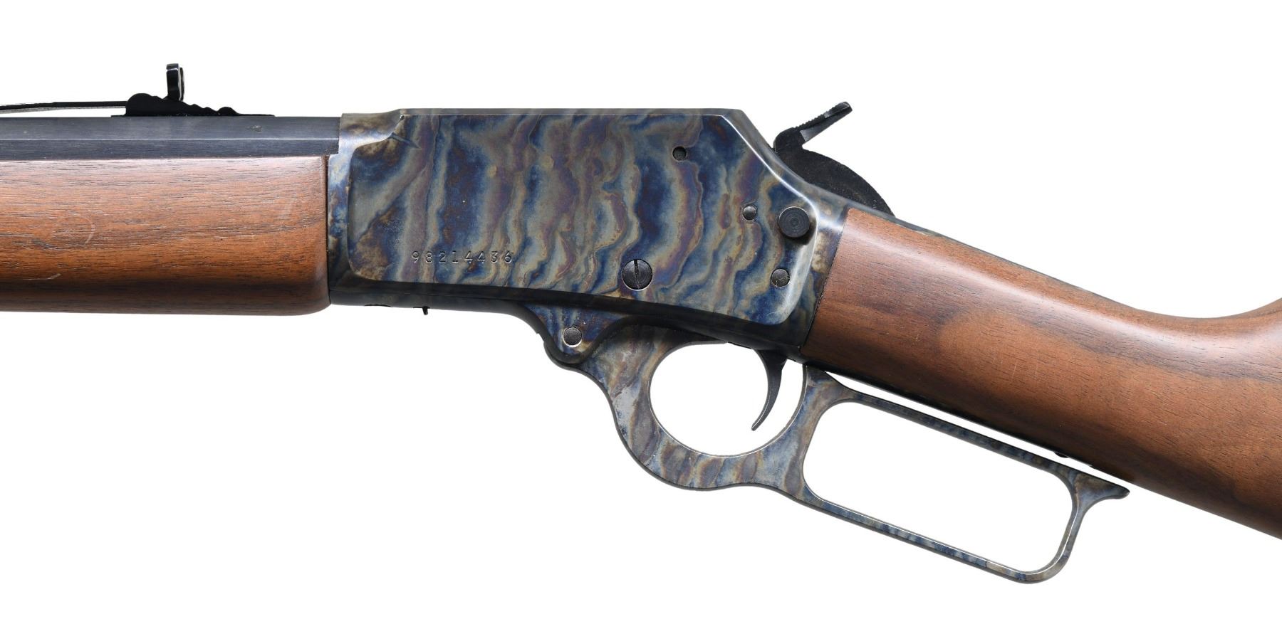 ACTION RIFLE. Cal. 38 Spl. S# 98214436. Mfg. 2002. Oct. 20" bbl. w/ Ballard rifling. Sporting sights. 10 Shot tube mag. Blued & case colored finishes w/ hammer block safety; factory turned for competitive shooting. Walnut stock set. CONDITION: very good to near excellent overall with white spots on barrel & scattered marks on wood. Very good shiny bore. (25-3607/MD). MODERN. $800-1,200.