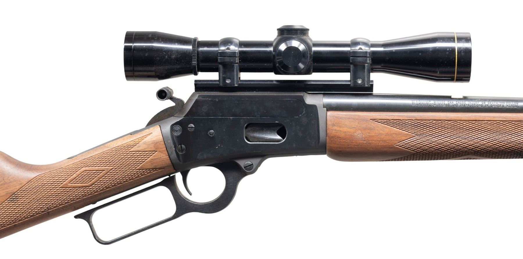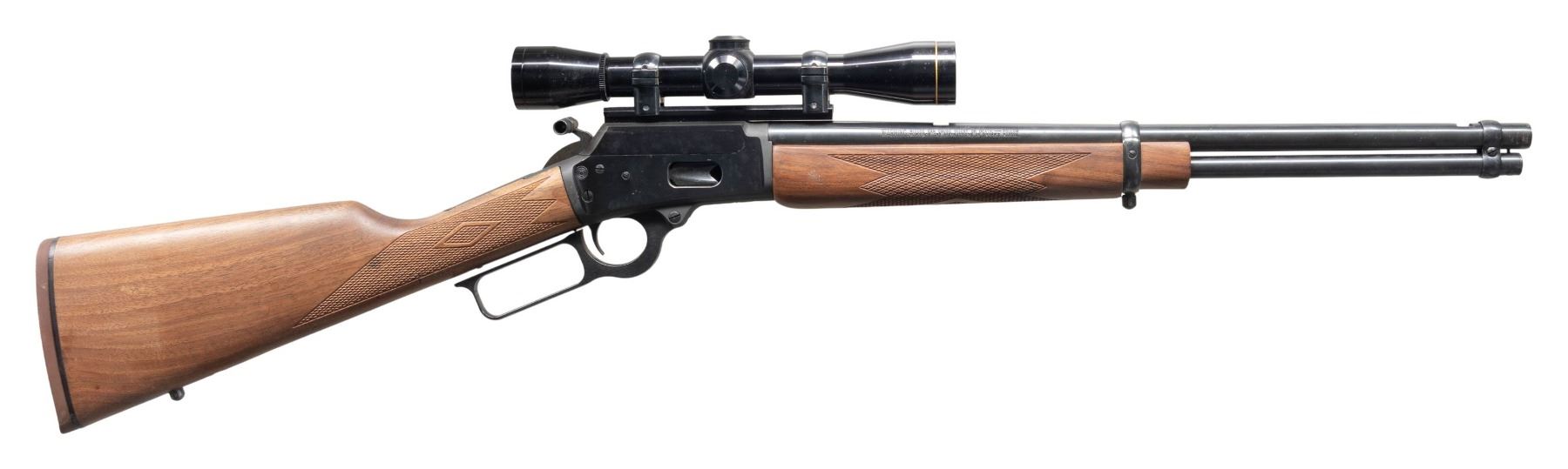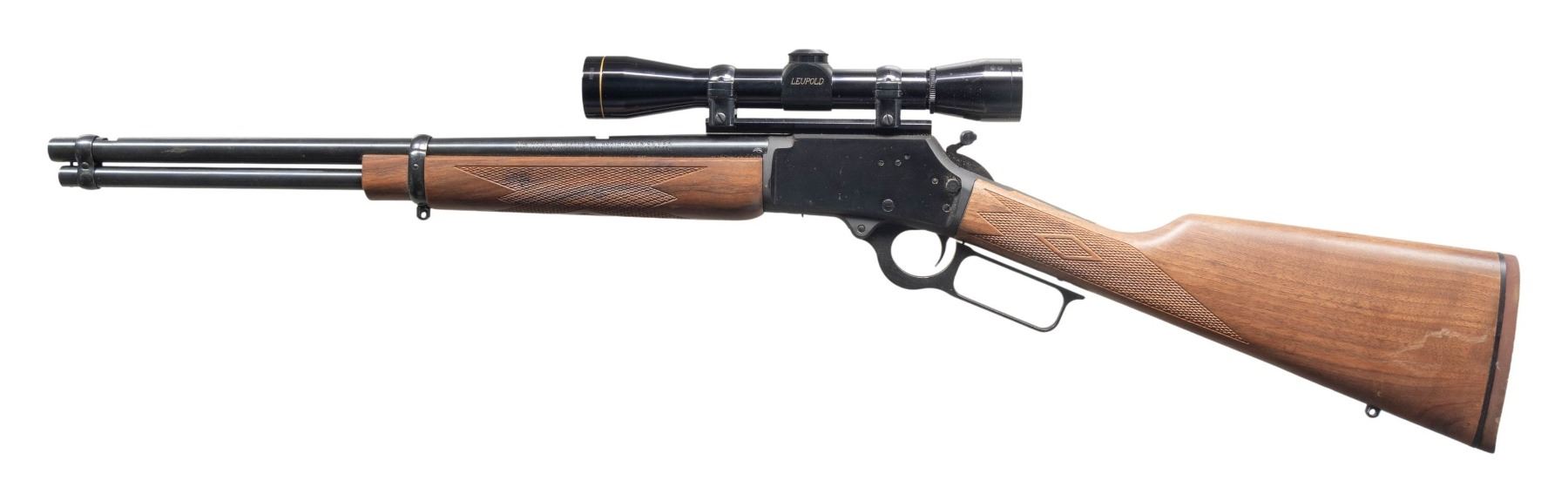 WITH LEUPOLD SCOPE. Cal. 357 Mag. or 38 Spl. S# 03038316. Mfg. 1997 as Model 1894CS. Micro-groove 18.5" bbl. w/out sporting sights. Leupold Gold Ring M8-4x, duplex scope on Weaver rings & base. Blued finish. 9 Shot tubular mag. Crossbolt safety. Cut checkered walnut stock set. CONDITION: very good blue with scattered spots of oxidation. Very good wood finish with handling marks. Very good bore. Very good scope finish with clear & serviceable optics. (25-3712/MD). MODERN. $400-600.