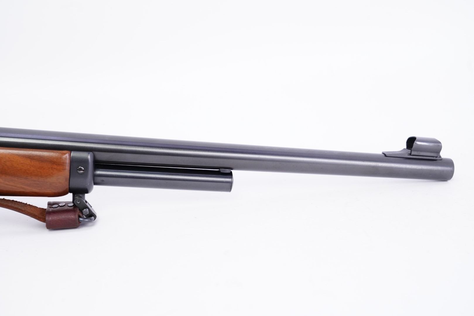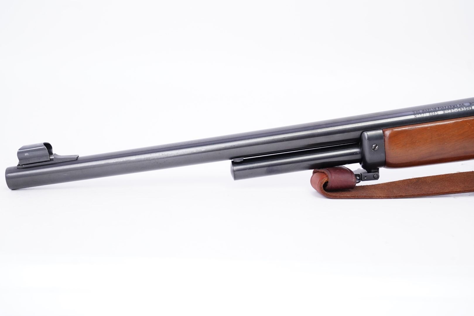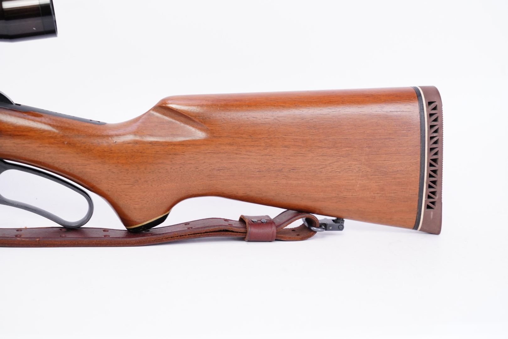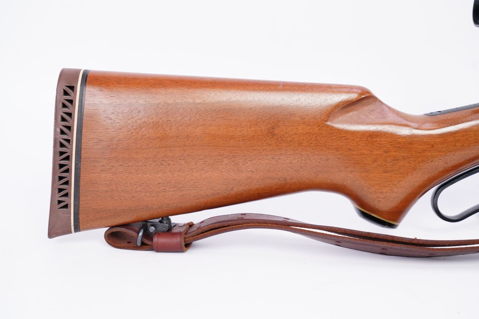 Stock Configuration & Condition: The stocks are two-piece smooth wood with a capped forearm and pistol grip, fluted straight comb, sling swivel front and rear with a brown leather sling attached, and a brown ventilated Marlin recoil pad. The Marlin bullseye is present in the belly. There are some scattered minor marks in the wood. There are no chips or cracks. The LOP measures 13 7/8" from the front of the trigger to the back of the recoil pad, which is soft and shows light wear. The stocks rate in about Fine overall condition.
