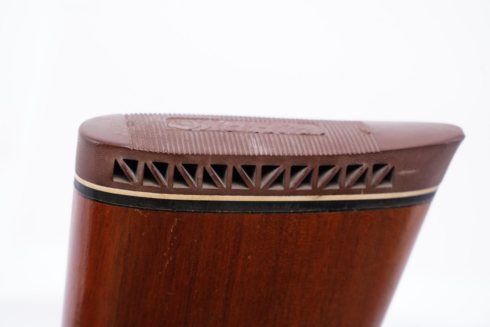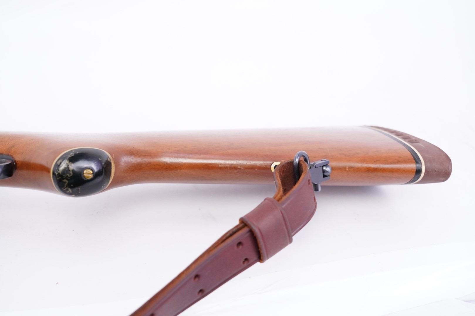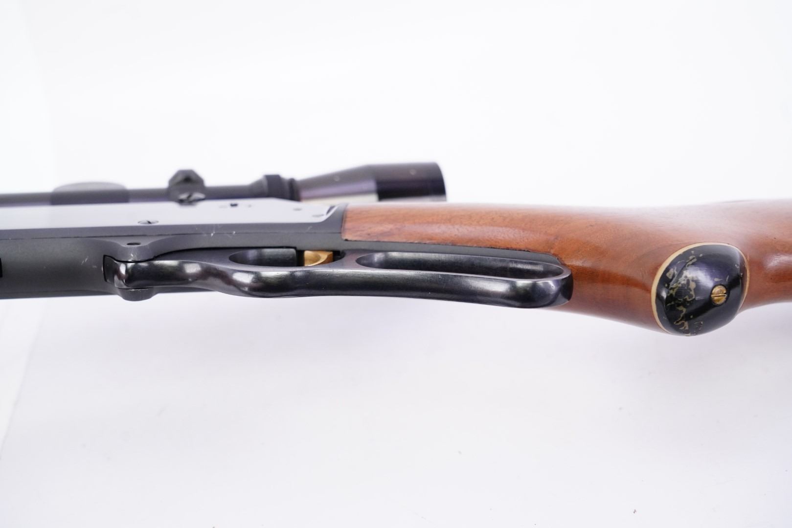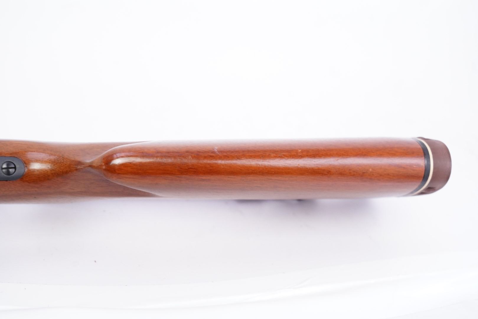 Stock Configuration & Condition: The stocks are two-piece smooth wood with a capped forearm and pistol grip, fluted straight comb, sling swivel front and rear with a brown leather sling attached, and a brown ventilated Marlin recoil pad. The Marlin bullseye is present in the belly. There are some scattered minor marks in the wood. There are no chips or cracks. The LOP measures 13 7/8" from the front of the trigger to the back of the recoil pad, which is soft and shows light wear. The stocks rate in about Fine overall condition.
