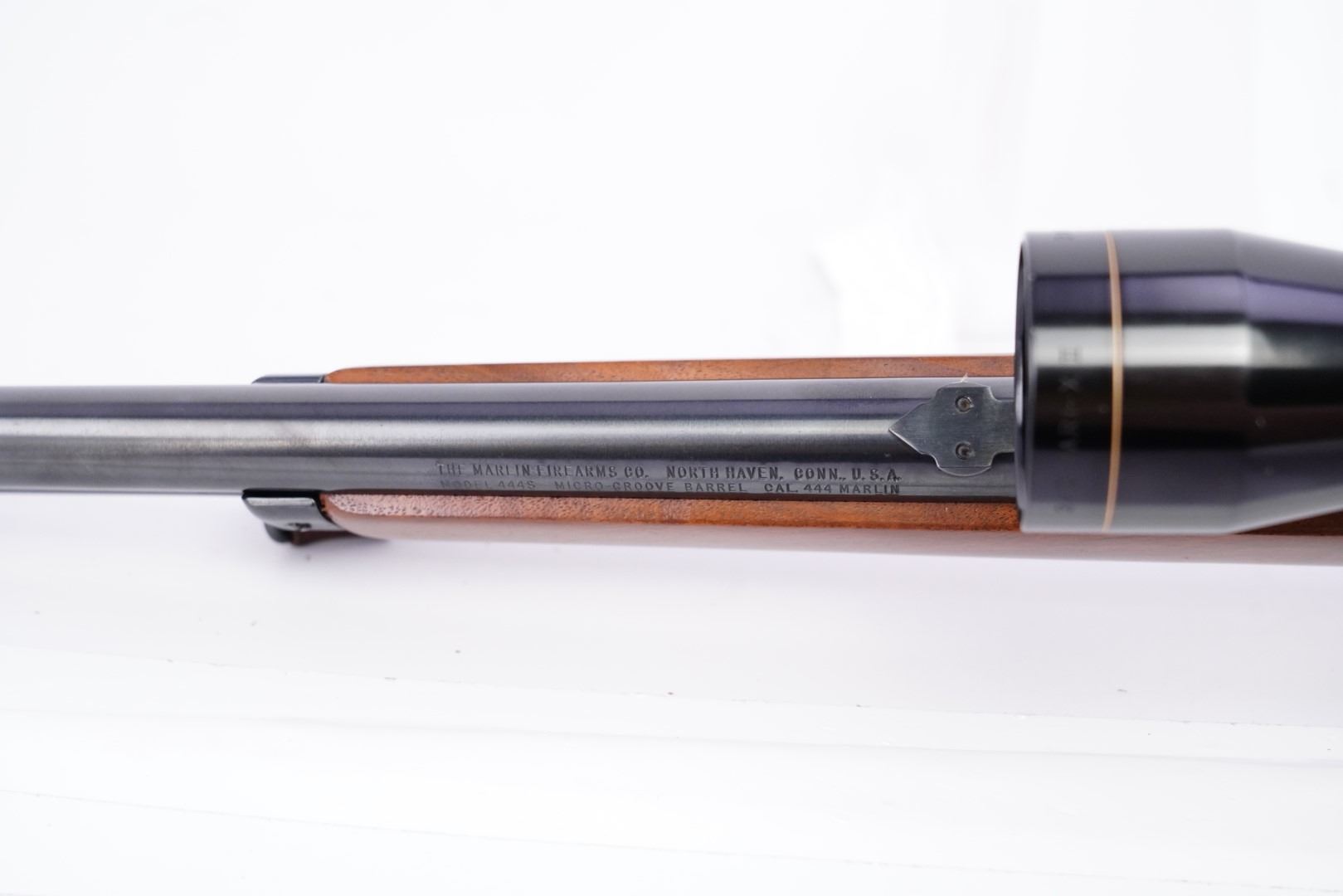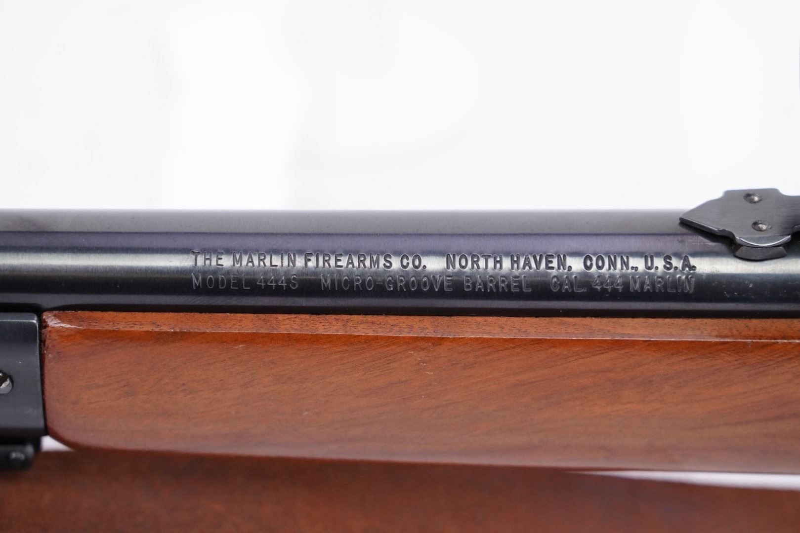 Markings: The left side of the barrel is marked "THe MARLIN FIReARMS CO. NORTH HAVeN, CONN., U.S.A. / MODeL 444S MICRO-GROOVe BARReL CAL. 444 MARLIN" and a circled "JM" proof mark. The upper tang is marked with the serial number.