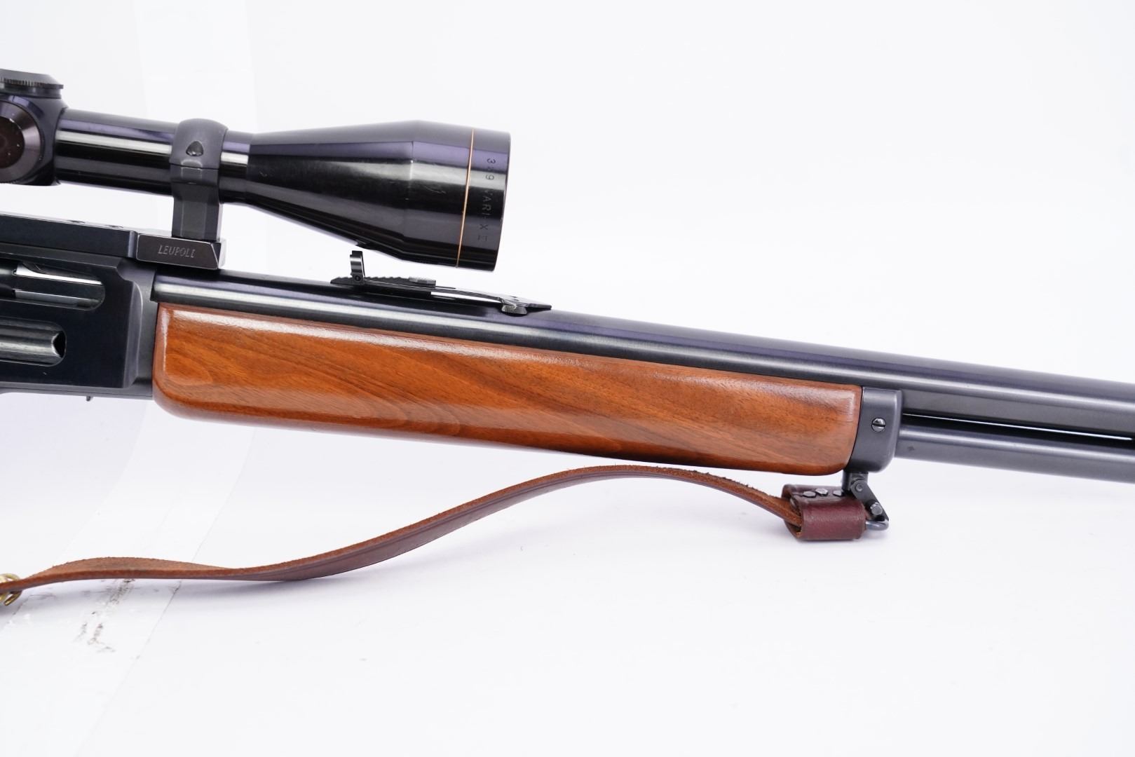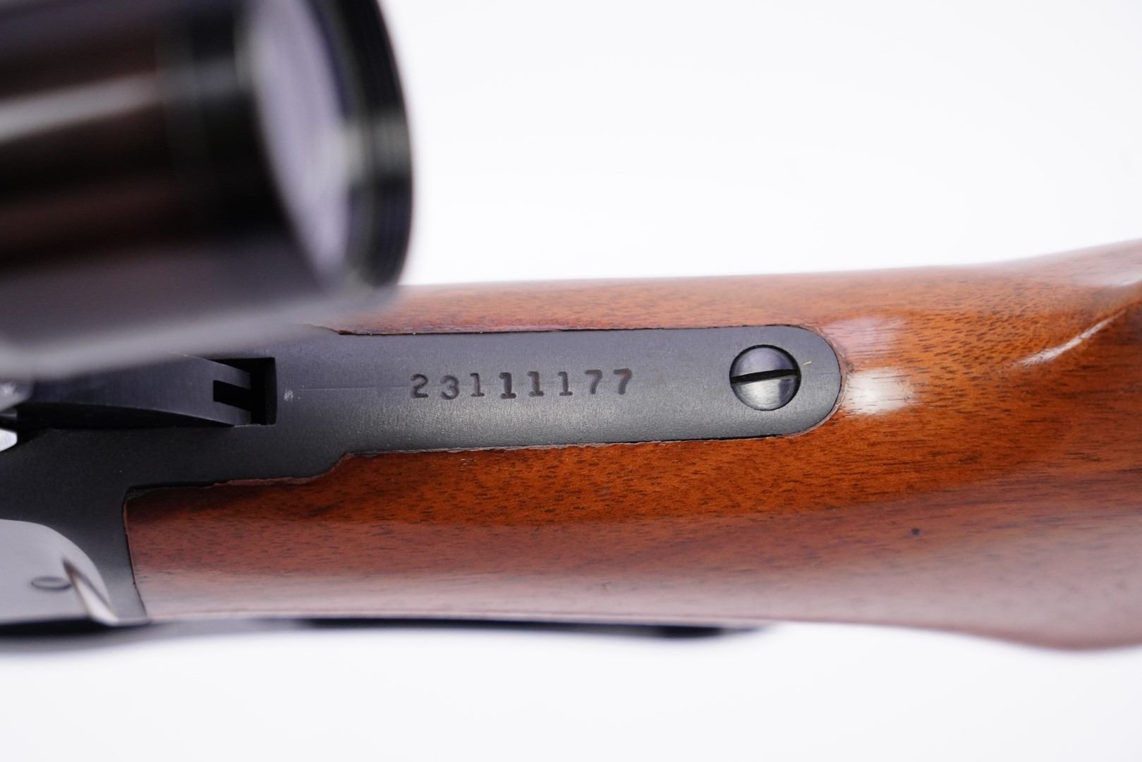 Sights / Optics: The front sight is a hooded brass beaded blade dovetailed to a serrated ramped riser that is screwed to the barrel. The rear sight is a folding U-notch elevator sight that is dovetailed to the barrel. The top of the receiver is equipped with a one-piece Leupold rail and two rings supporting a Leupold Vari-X II scope with 3-9x magnification and a fine crosshair reticle. The glass is clear. The scope rates in about Fine condition.