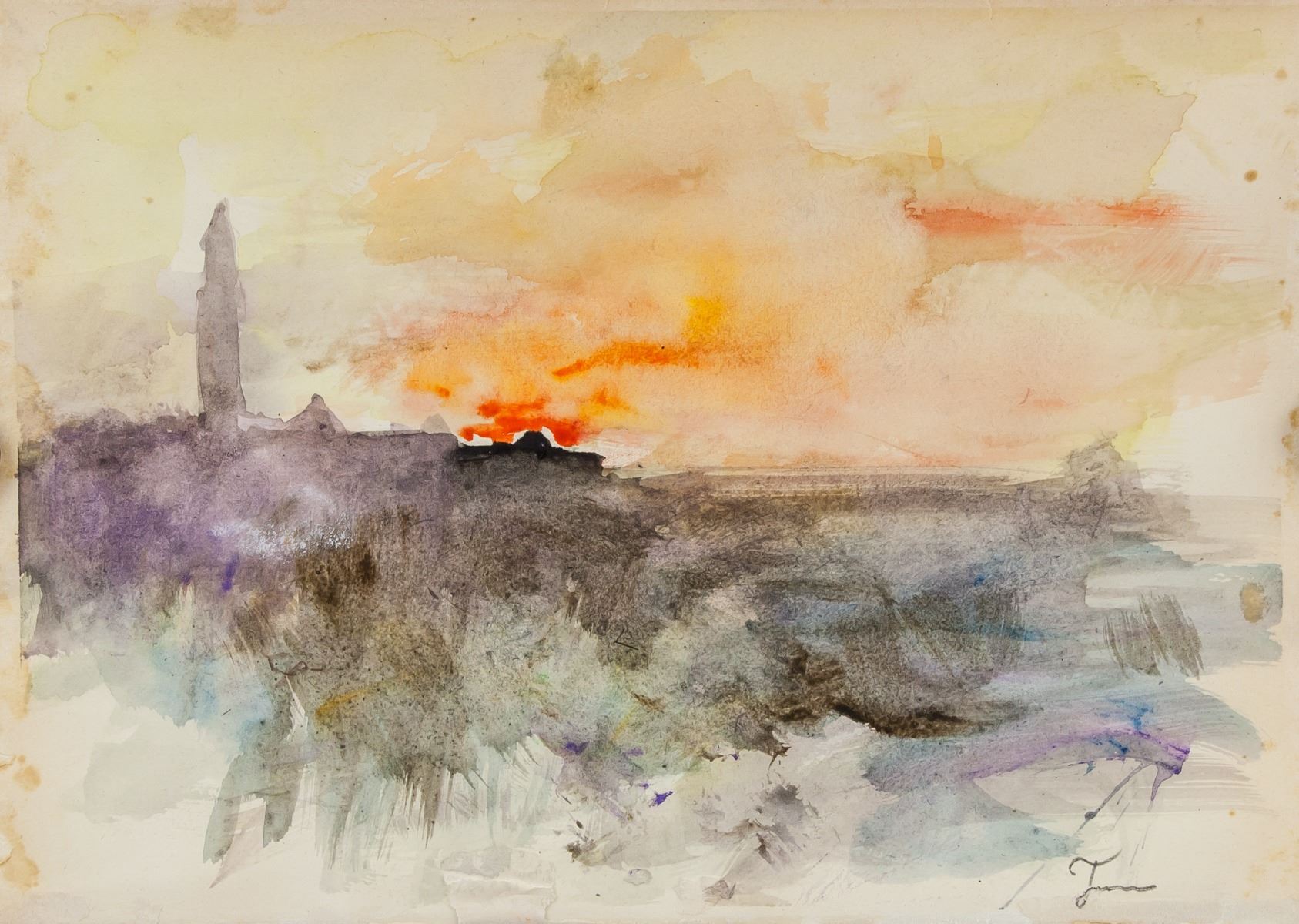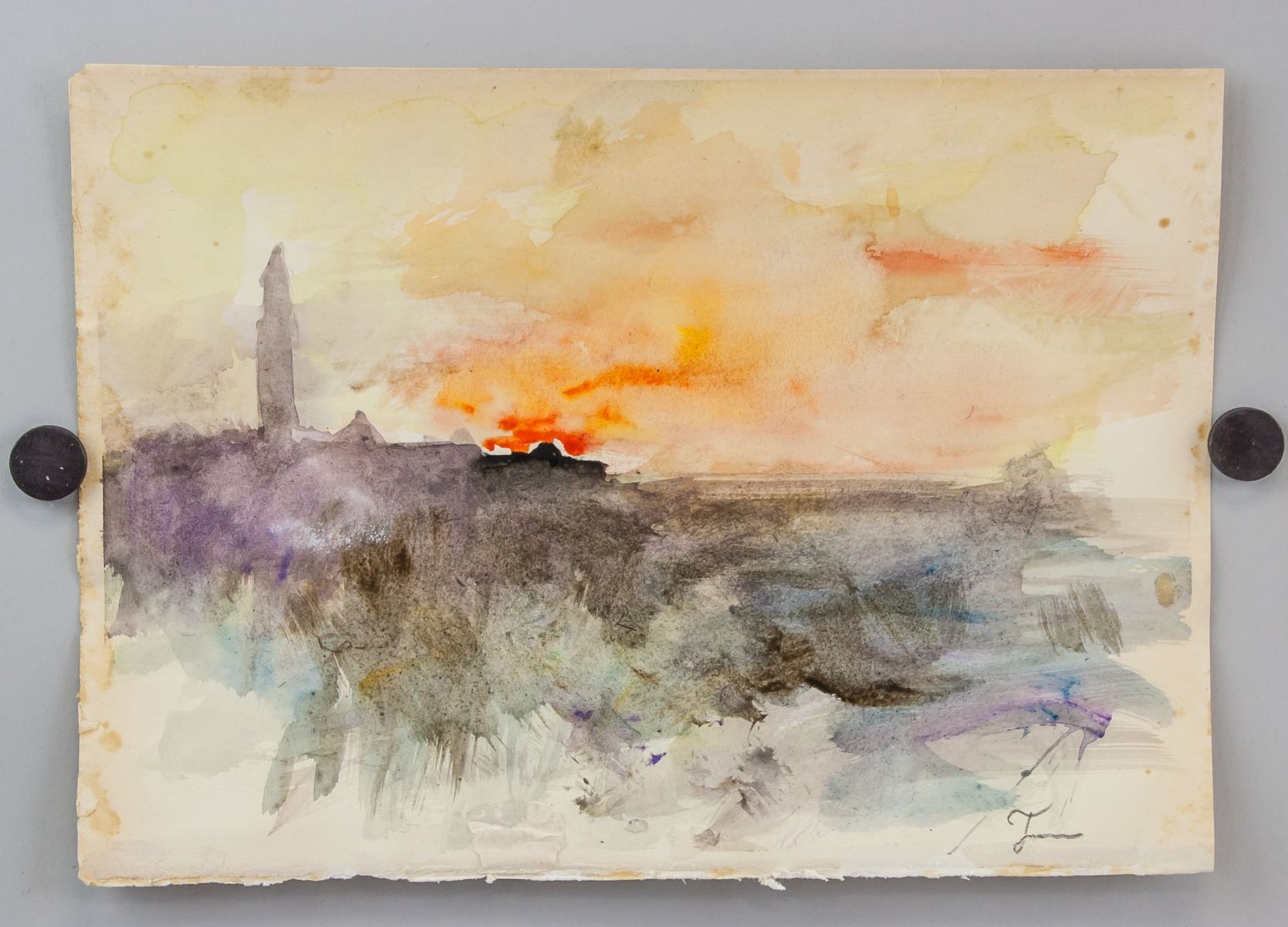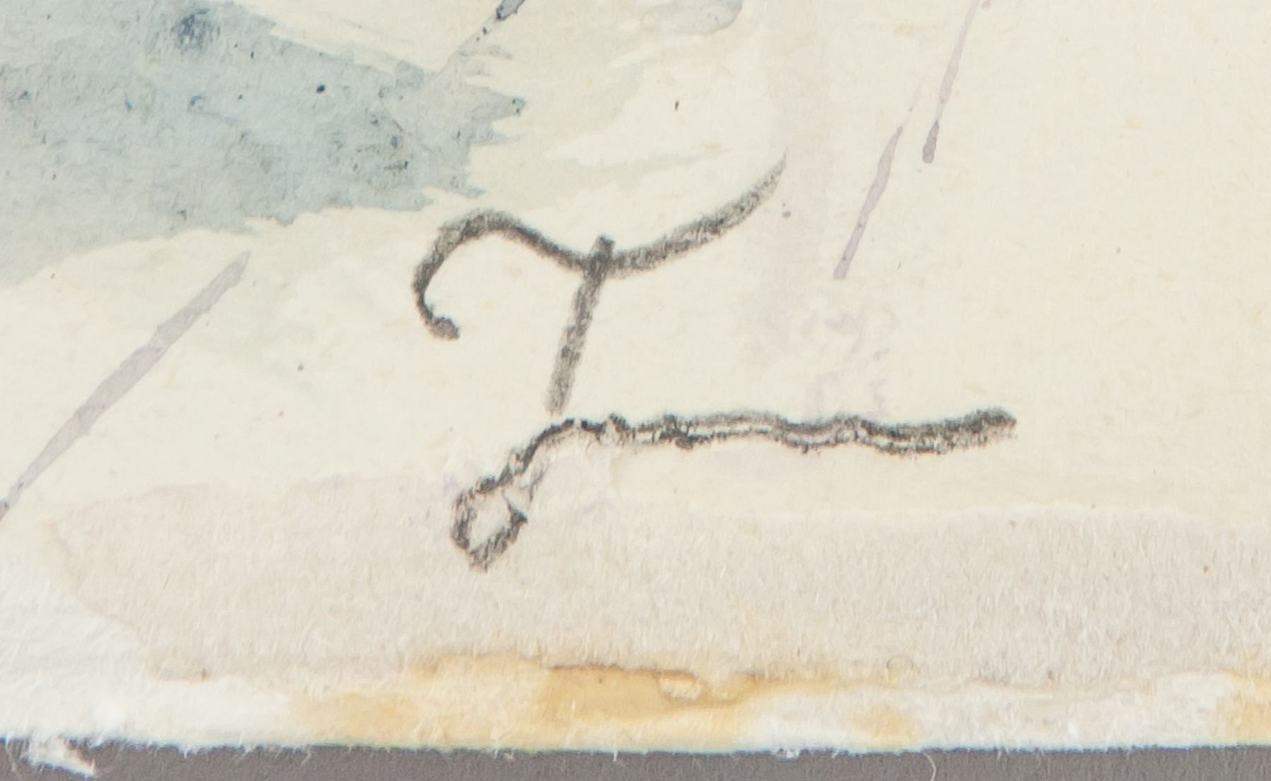 Watercolor on paper. Featuring a landscape scene. Signed and attr. J.M.W. Turner (British, 1775-1851) with monogram on the lower right corner. 21 x 29 cm (8.3 x 11.4 inches). J.M.W. Turner was an English Romanticist widely considered one of the most innovative landscape painters of the 19th century. Radiating light from a particular source, Turner created tunnel-like luminosity within each painting. He is often credited for elevating landscape painting to a status it had not yet achieved in England. Like his contemporary John Constable, he made spontaneous watercolors and oil studies of fleeting weather phenomena, such as rainbows, storms, and volcanic ash. “I have no secret but hard work. This is a secret that many never learn, and they don't succeed because they don't learn it,” he once explained. “Labor is the genius that changes the world from ugliness to beauty, and the great curse to a great blessing.” Born Joseph Mallord William Turner on April 23, 1775 in London, United Kingdom, he was admitted to the Royal Academy of Art in 1789 at an early age. During the 1790s, Turner offset his living expenses by creating watercolor and etching reproductions for topographical books on landscapes. By the 1800s, he had been inducted into the Royal Academy, while his work had adopted the golden tones of Claude Lorrain and Nicolas Poussin. Embarking on a tour of Europe during the 1810s, he filled his sketchbooks with studies of ruins and spectacular sunsets. During the latter decades of his career he led an eccentric and secretive lifestyle, about which few of his peers knew. Turner died on December 19, 1851 in London, United Kingdom. Today, his works are held in the collections of Yale Center for British Art in New Haven, the Tate Gallery in London, and the Museum of Fine Arts in Boston, among others. PROVENANCE: Private estate (Perugia, Italy)