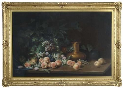 JNO N. PIERSCHE (19th Century) BOUNTIFUL FRUIT. Pastel on paper tabletop scene shows a large grouping of peaches, grapes and other fruits. A copper vase and leaves serve as backdrop. Signed lower left and dated "92". Housed in a magnificent gilt gesso decorated frame with glass. SIGHT SIZE: 31" x 47". CONDITION: Very good. 9-28035