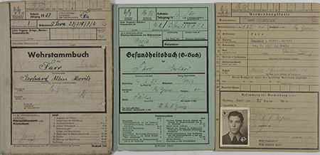 (1915 - 1976) SS-Standartenführer and the Waffen-SS's youngest regimental colonel, a personal adjutant to Himmler and tank commander who saw combat on both the Eastern and Western fronts. Peiper is most remembered for the massacre of American prisoners at Malmedy. Although not tried for that crime, he was convicted of the murder of prisoners and jailed for eleven years. Retiring to France, he was identified and gunned-down at his home, which was burned. Rare war-date signed document, the SS service record and health books issued to SS Panzer Grenadier Gerhard Farr. Two separate books are present, with the service record showing that Farr was born in 1927, drafted for the Labor Service on March 31, 1944, and volunteered to serve in the SS Panzer Grenadiers Training and Reserve Battalion I on Sep. 11, 1944. On Nov. 13, 1944 Peiper signs the book, apparently activating the young soldier and mustering him into the Liebstandarte Adolf Hitler and placing an official stamp across the endorsement. Thirty-four days later Farr would likely have been present during the massacre of 84 American prisoners at Malmedy.