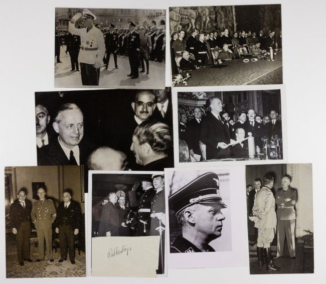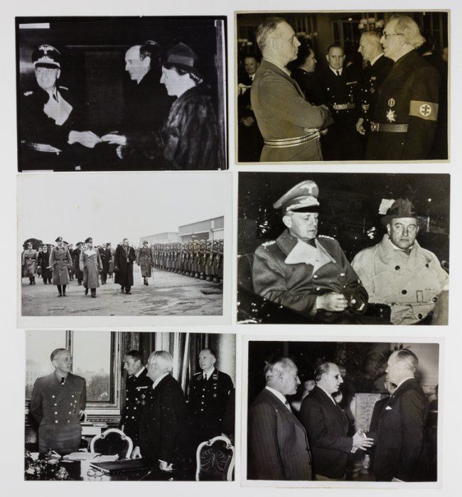 Good lot of 21 original German news photographs, all stamped on the verso, some also with paper captions, featuring German Foreign Minister Joachim von Ribbentrop undertaking his official duties. The minster is shown meeting his counterparts from Italy, France, South Africa, Finland, and other countries, reviewing troops, meeting German military, etc. Most photos 5" x 7" or larger. Very good.