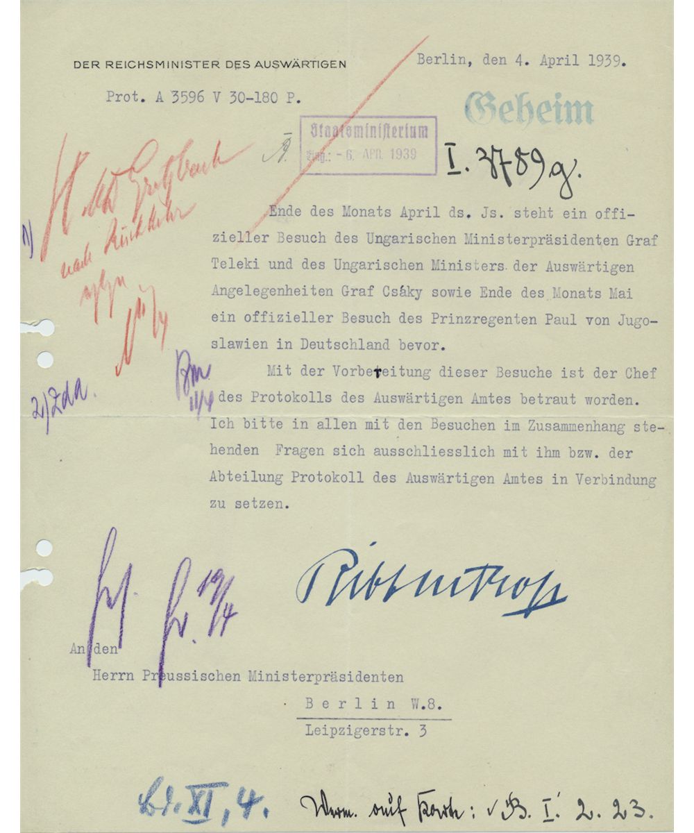 (1893 - 1946) Nazi foreign minister. First of the Nuremberg defendants to hang on October 16, 1946. T.L.S. with printed signature on his State Department letterhead, 1p. 4to., Berlin, Apr. 4, 1939 to HERMANN GOERING. In part: "...At the end of the month of April of this year, we are expecting a visit from the Hungarian Minister President Graf Teleki and the Minister of State Graf Csaky...and at the end of May and official visit by Prince Regent Paul of Yugoslavia...". Multiple dockets, else very good.