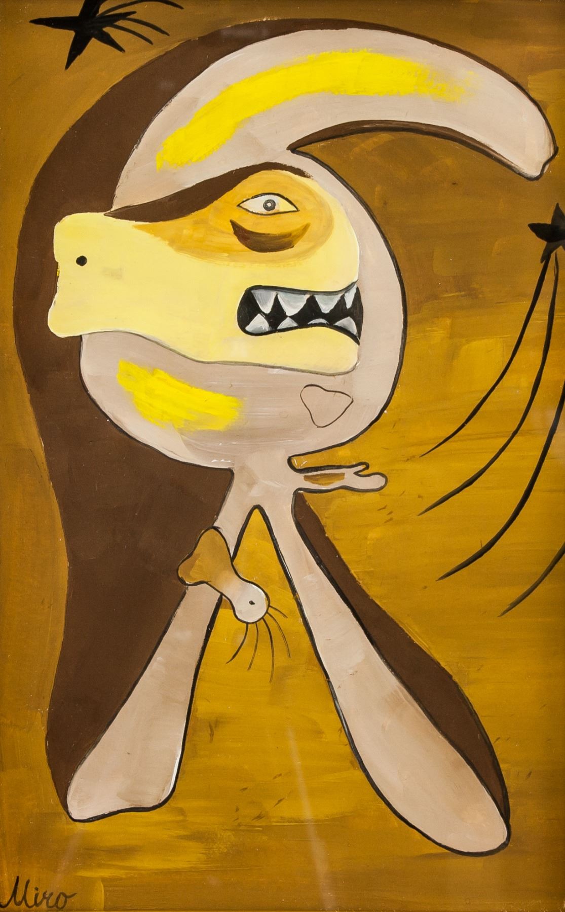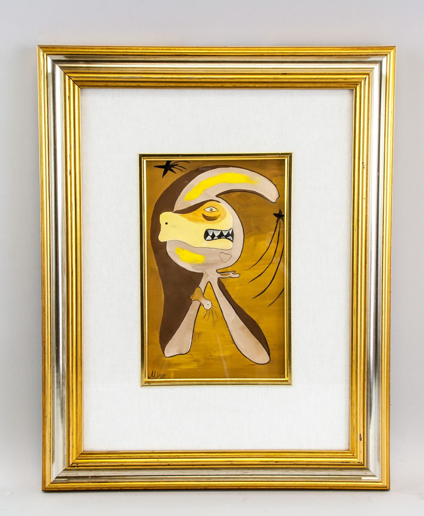 Gouache on paper framed. Featuring a surrealist artwork. Signed and attr. Joan Miro (Spanish, 1893-1983) on lower left margin. 9.3 x 5.9 in. (23.5 x 15 cm). Joan Miro was a seminal figure in 20th-century avant-garde painting. The Spanish artist’s innovative use of line, organic shapes, and color represents a major contribution to Surrealism. Representative of his ability to conjure evocative space - Miro's famed triptych Blue I,II,II (1961), portrays a floating world using only blue, orange, and black. “Little by little, I've reached the stage of using only a small number of forms and colors,” the artist reflected. "It's not the first time that painting has been done with a very narrow range of colors. PROVENANCE: Southern Ontario estate