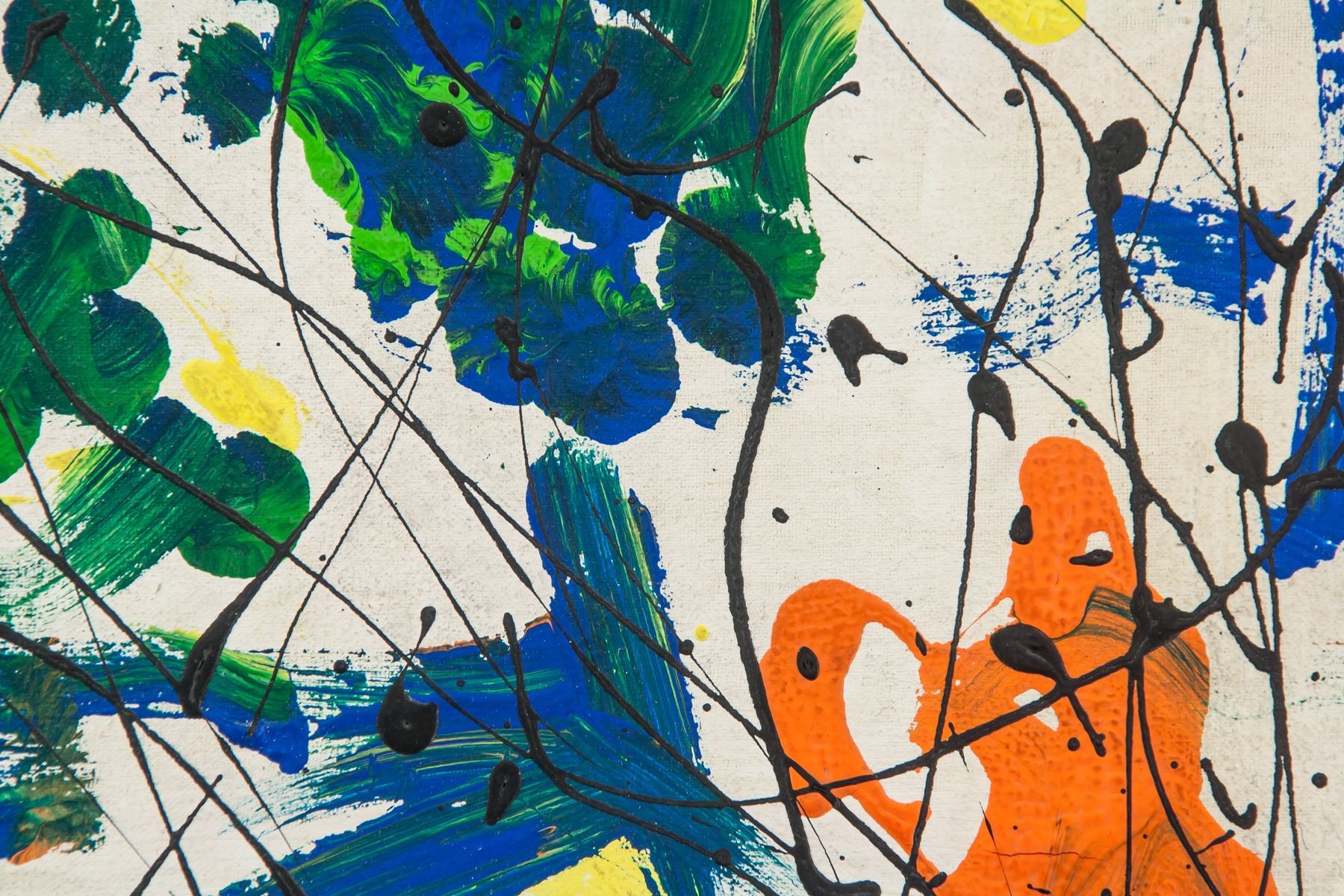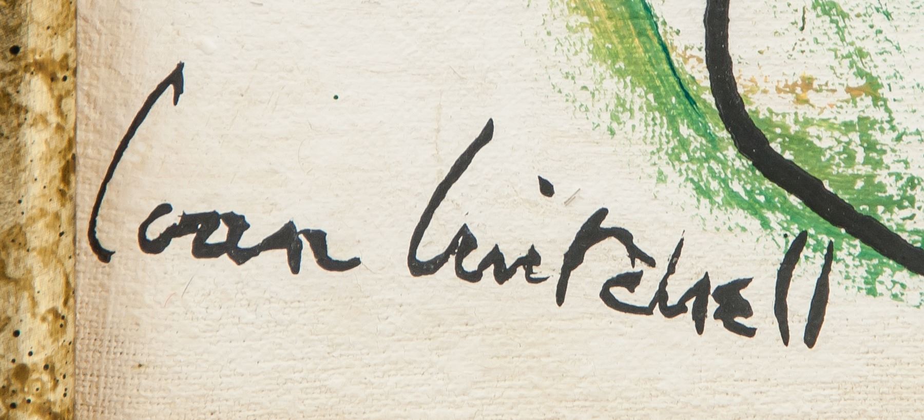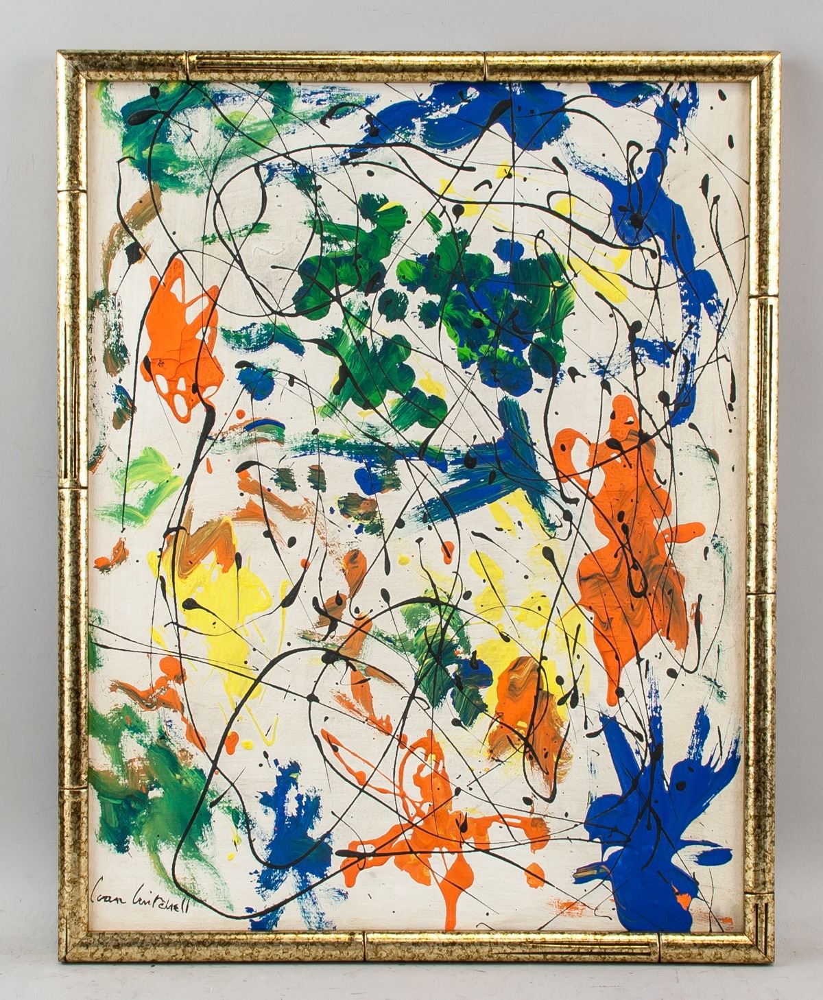 Oil on canvas, framed. Featuring an abstract expressionist composition. Signed and attr. Joan Mitchell (American, 1925-1992) on the lower right corner. 45.5 x 36 cm (17.9 x 14.2 inches). Frame size: 47.5 x 37.5 cm (18.7 x 14.8 inches). In 1950s New York, Joan Mitchell was a lively, argumentative member of the famed Cedar Bar crowd, alongside Franz Kline, Willem de Kooning, and other notable first- and second-generation Abstract Expressionist painters. Based on landscape imagery and flowers, her large-scale paintings investigate the potential of big, aggressive brushstrokes and vivid color to convey emotion. "I try to eliminate cliches, extraneous material," she once said. PROVENANCE: Southern Ontario estate