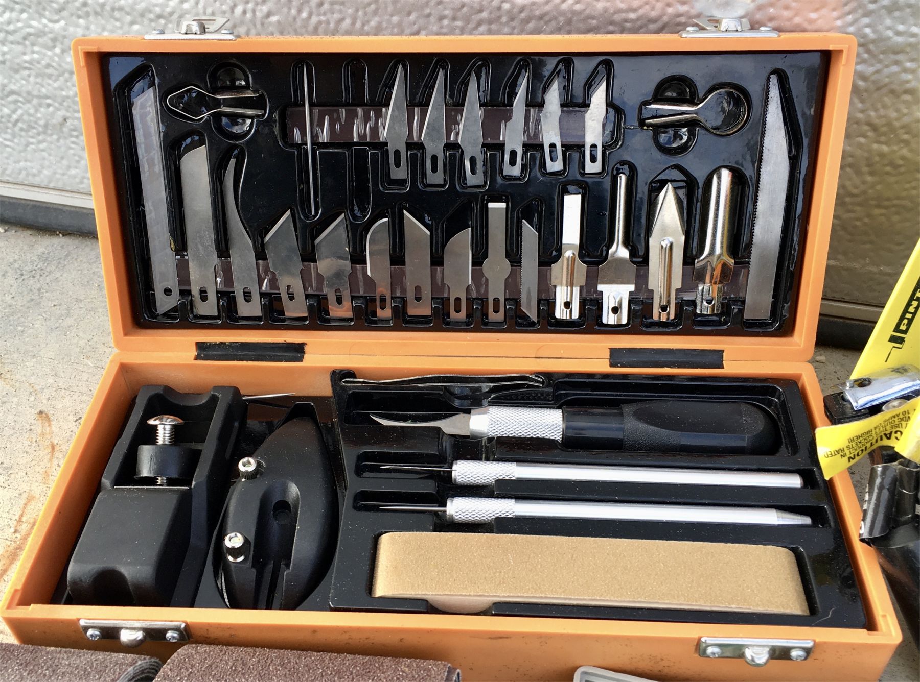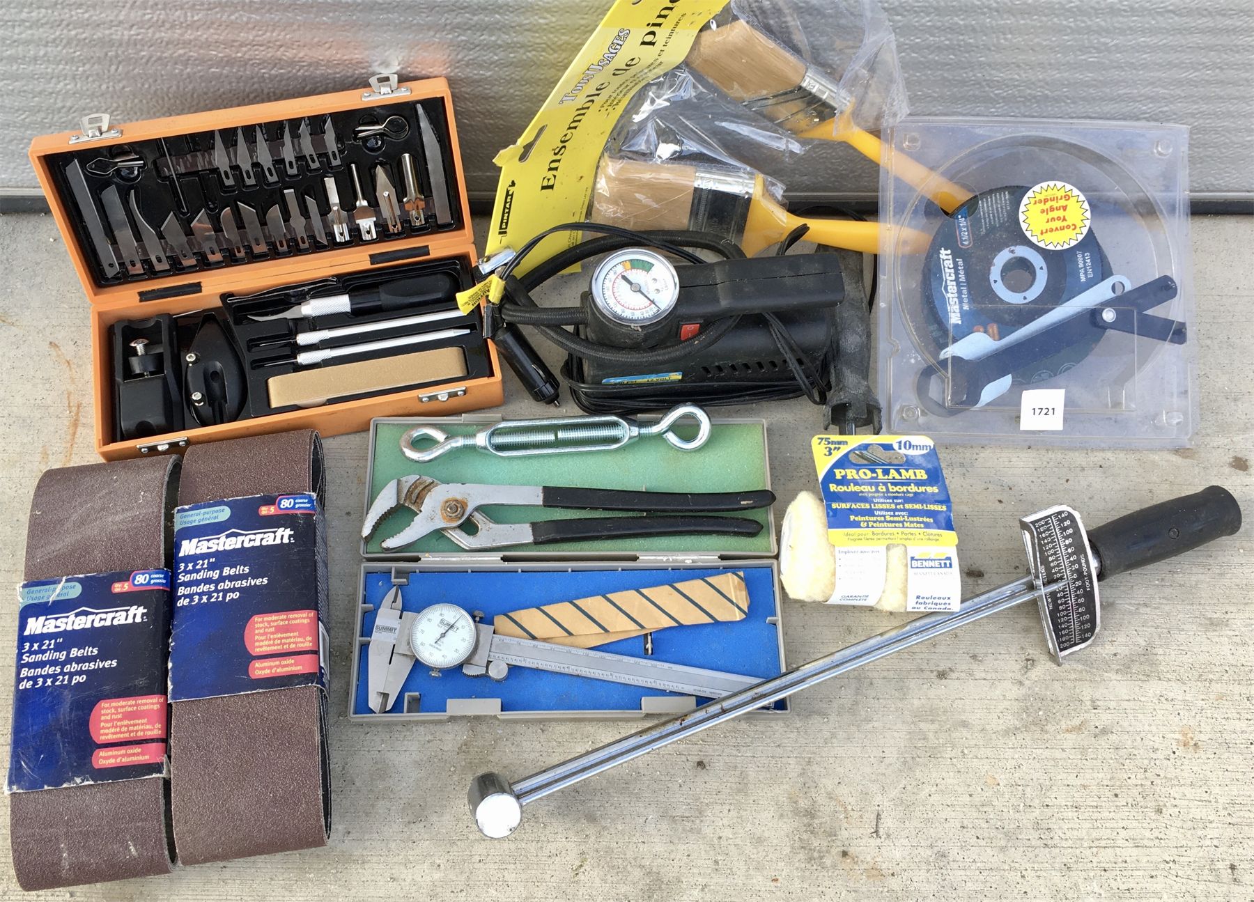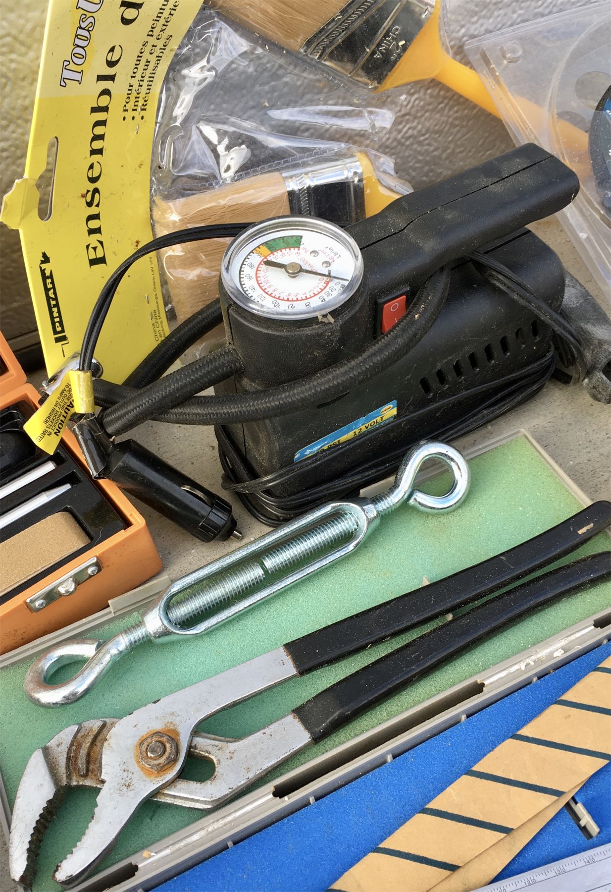JOB LOT - 12V 260 PSI COMPRESSOR, EXACTO KIT, GRIND WHEELS, BELTS, ETC