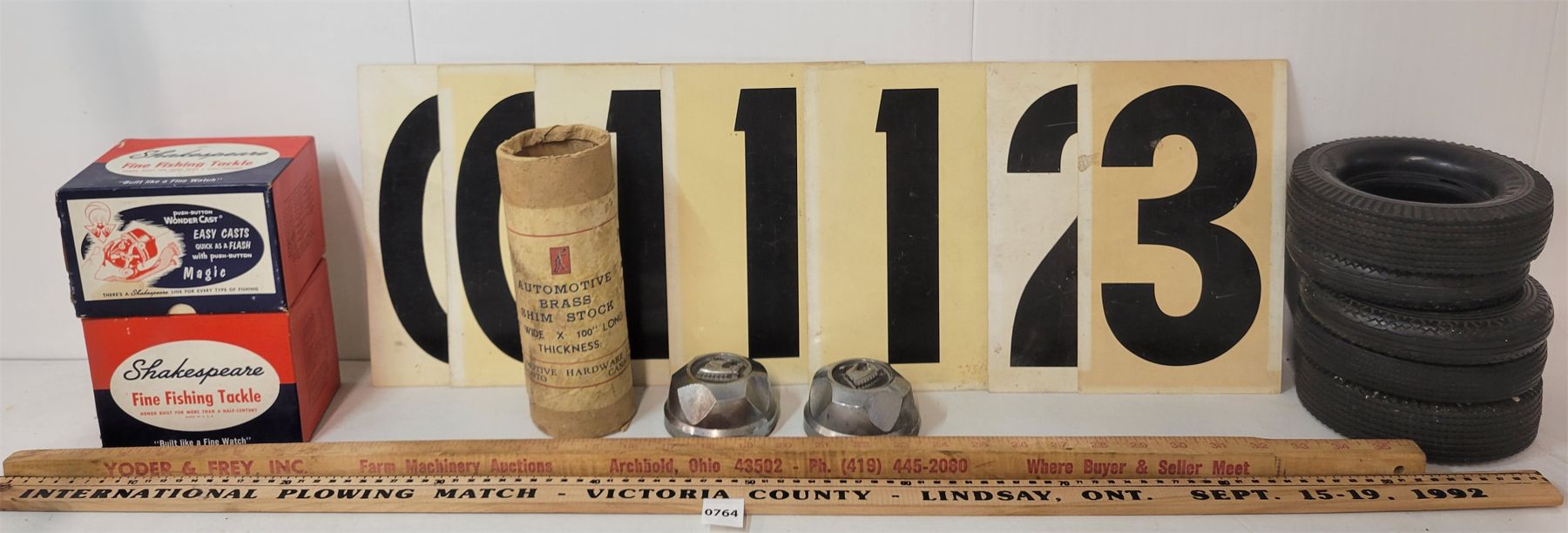NOTE: NO INSERTS IN TIRE ASHTRAYS. BRASS SHIM W/ CONTENTS. SHAKESPEARE FISHING RACKLE BOXES ARE EMPTY. SEE ALL PICS.