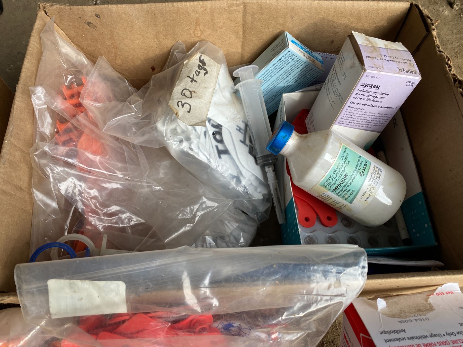 INCLUDES: EAR TAGS, IVOMEC ( 1/2 FULL BOTTLES), 2 X BURDIZZO, SYRINGES, ETC.
