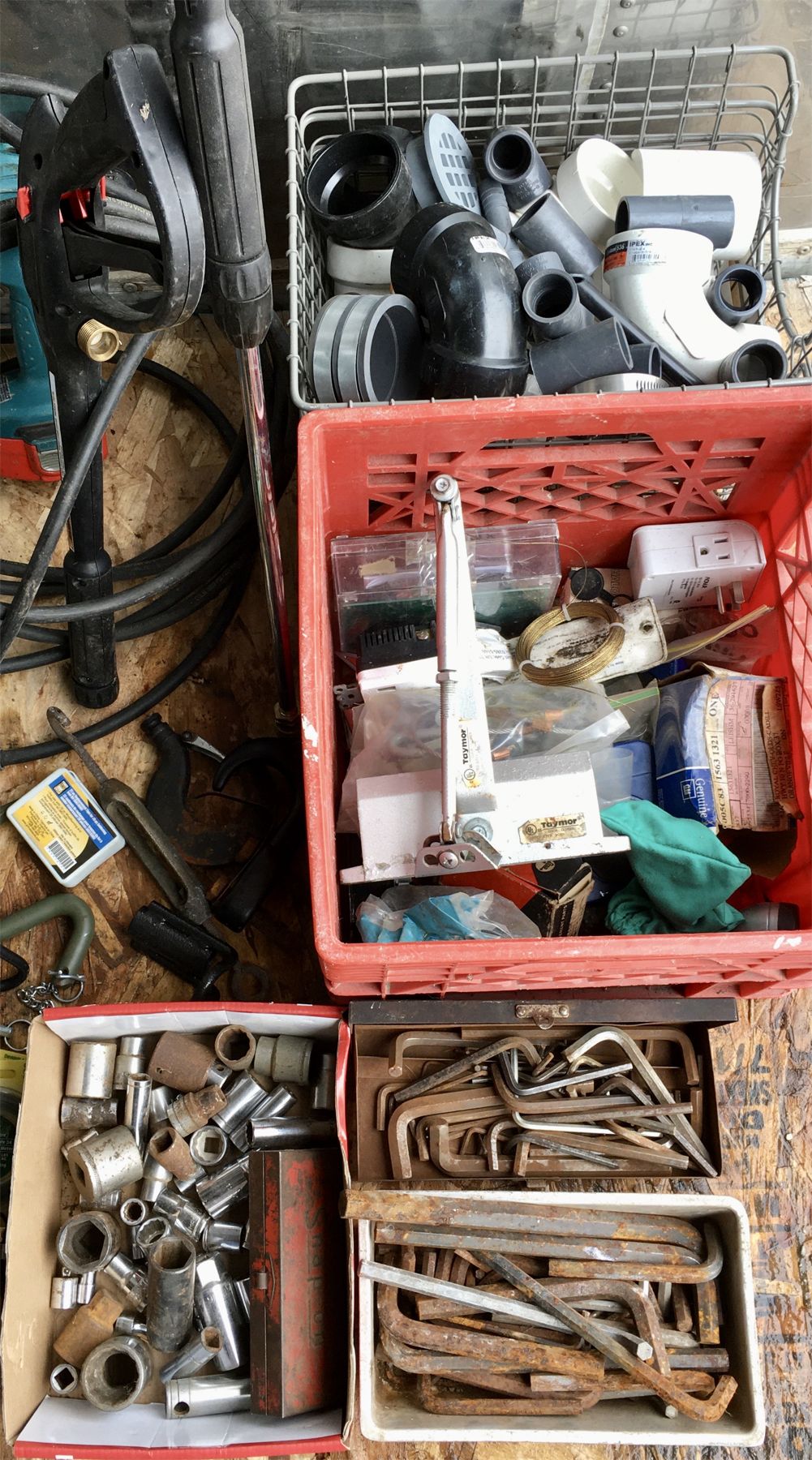 JOB LOT - MISC TOOLS, HARDWARE - INCL LADDER, WAND, SOCKETS, ETC