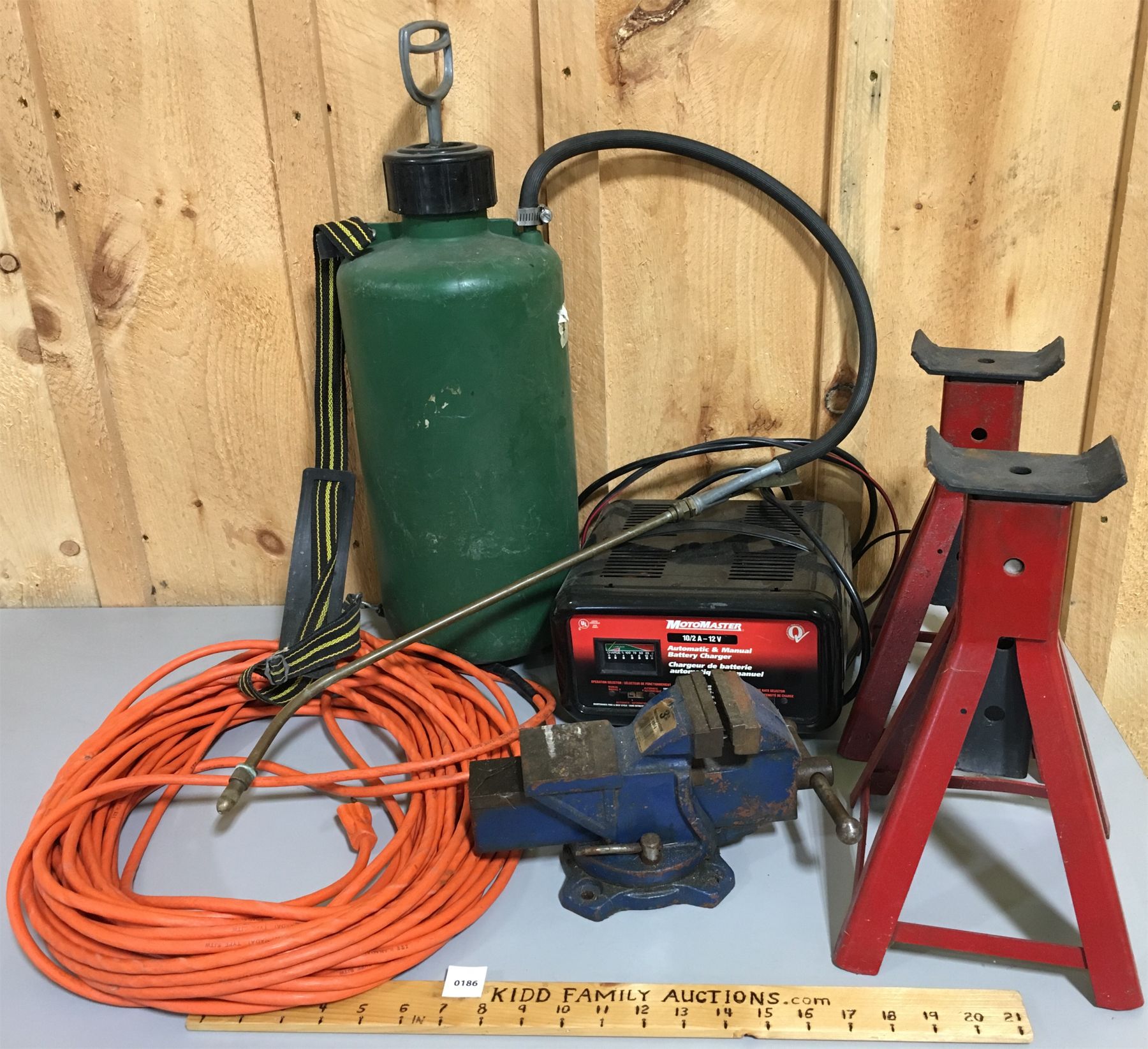 JOB LOT - MOTOMASTER AUTO & MANUAL BATTERY CHARGER, SAFETY STANDS, SPRAYER, EXT CORD, 3 INCH VICE