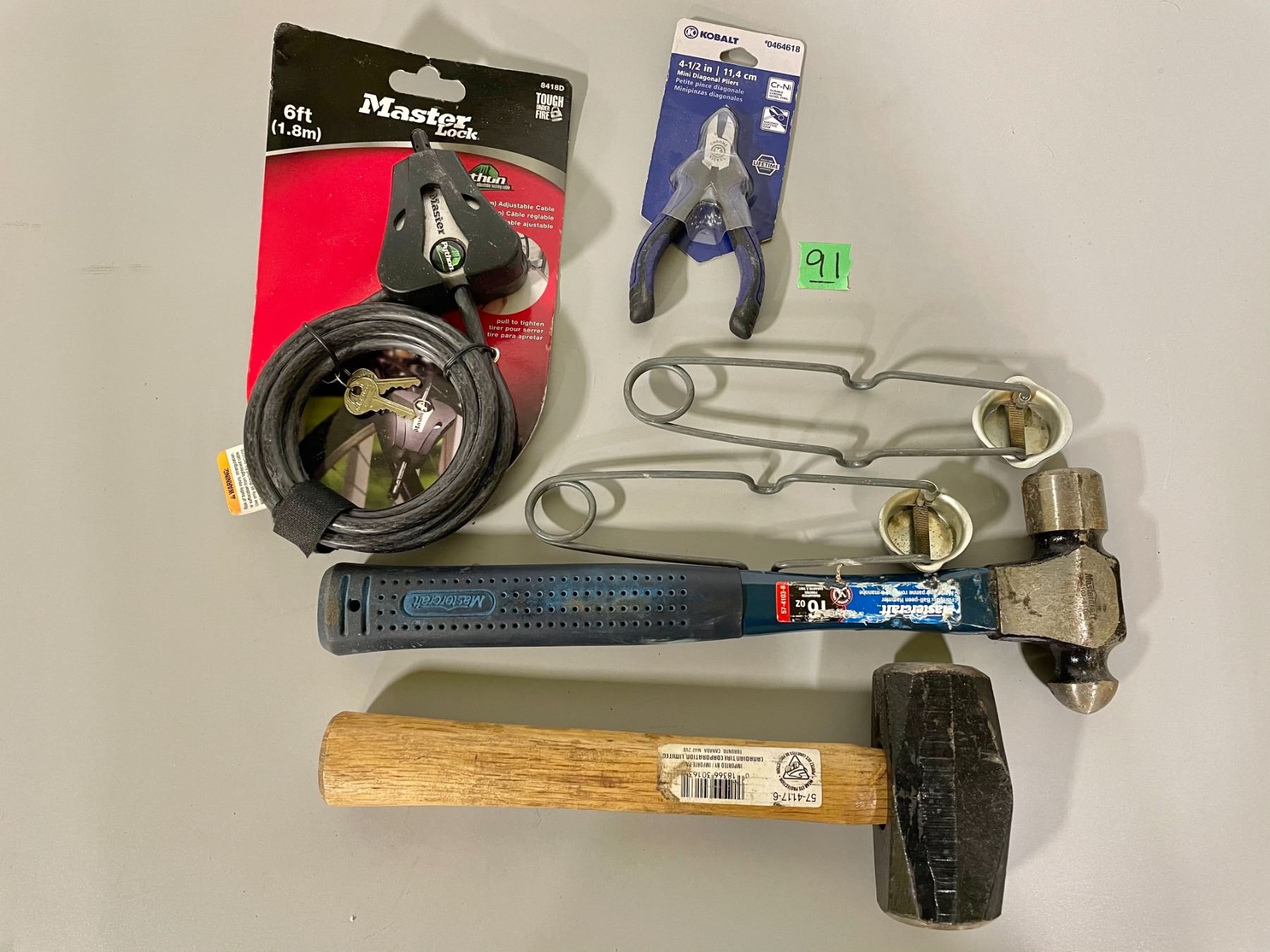 2 X HAMMERS, 6' CABLE LOCK, STRIKERS, PLIERS