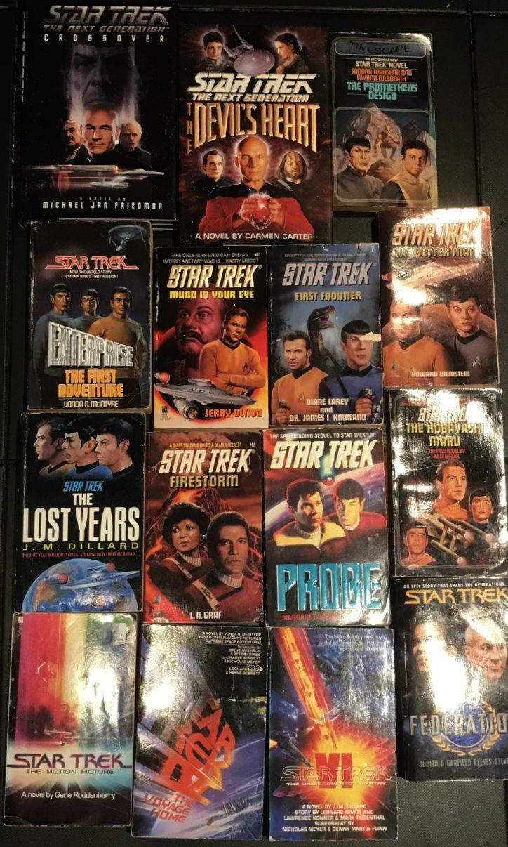 Paperback titles: The Prometheus design, The motion picture, The lost years, The first adventure, Mudd in your eye, The voyage home, Firestorm, Probe, The undiscovered country, First Frontier, The better man, The Kobayashi maru, Federation. Hardback titles: The Devil's heart, Crossover.