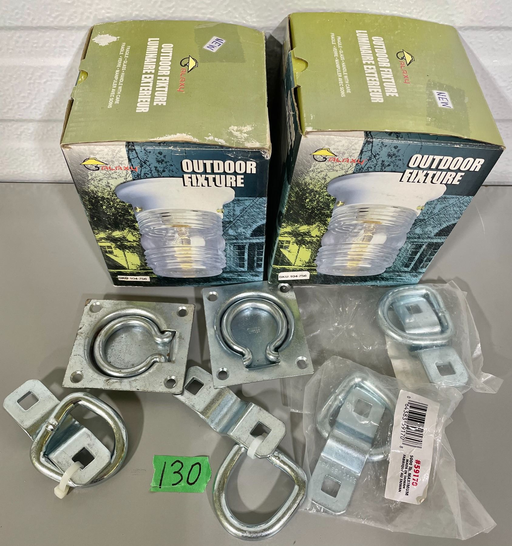 JOB LOT - TIE DOWN HARDWARE & 2 X NEW OUTDOOR LIGHT FIXTURES