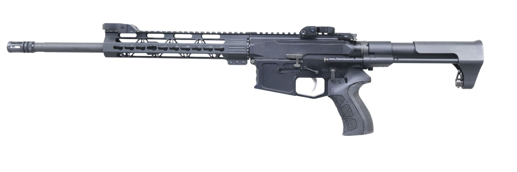 Cal. 9mm. S# KS-05842. Bbl. 16". A blowback operated carbine chambered in 9mm. Muzzle terminated w/ A2 style flash hider, marked "1/2x36 TPI". 10" KeyMod rail system, regulated w/ flat top upper receiver providing 16" of rail space for mounting optics / accessories. Rail currently sporting folding, BUIS, consisting of protected post front sight & dual aperture, windage adjustable rear sight. Extended charging handle. No brass deflector or forward assist. Extended mag release / bolt release. Pistol grip w/ removable, soft, rubber insert. Troy Industries, 5 position collapsible shoulder stock w/ QD swivel socket w/ swivel. Right side mag well marked: "MOLON LABE" w/ Spartan skull. MAGS: 2 steel 20 rd. & 2 steel 30 rd. UNATTACHED ACCESSORIES: Blackhawk black nylon transport case. CONDITION: Finish complete & consistent w/ some thinning in a few areas of mechanical intervention & high spots. Bright bore w/ strong rifling. Fire control mechanism appears to function correctly when cycled by hand. (25-816/JZ). MODERN. $500-800.
