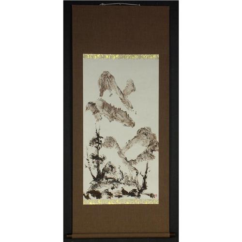 INK ON PAPER IN SCROLL FORM, Joe Brotherton (1918-), MO/WA/CA. "Summer near Bozeman-Bridger Range". Chopmark signature lower right. Mounted with brown fabric and decorative gold trim. Rolls up into a scroll form. More info. at the front desk. 30" x 16"(image size)/ 49" x 21.5" mounted.