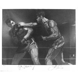 <b>1531. JOE LOUIS AND MAX SCHMELLING </b>Stunning S.P., a 20" x 17" color limited edition impression (#1194/15000) of artist Jack Peak's famous painting of Schmelling and Louis punching away in their second championship fight, signed in full in pencil by both Schmelling and Louis in the white bottom margin. Matted and framed, fine condition.<b>$300-400</b>