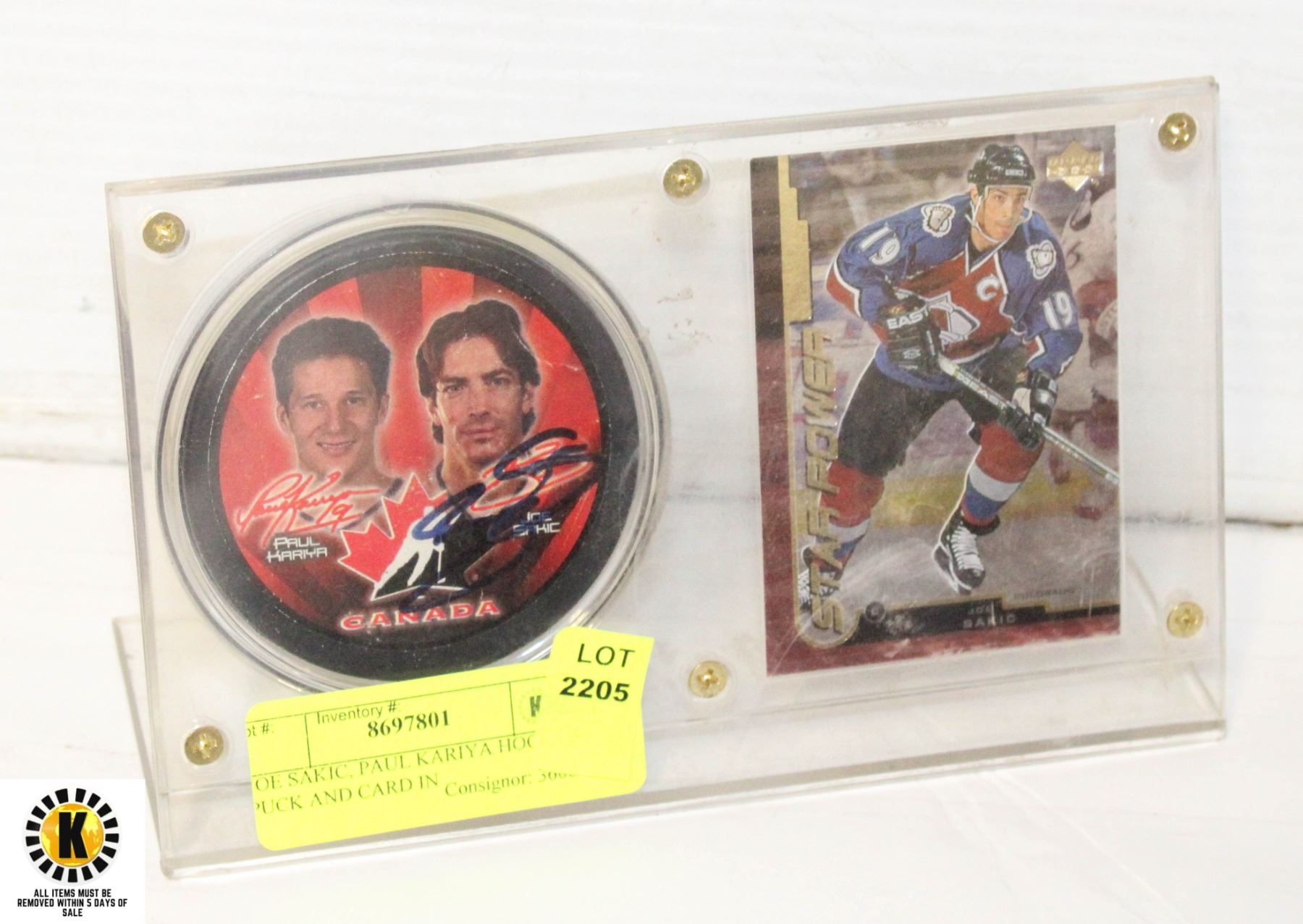 JOE SAKIC, PAUL KARIYA HOCKEY PUCK AND CARD IN