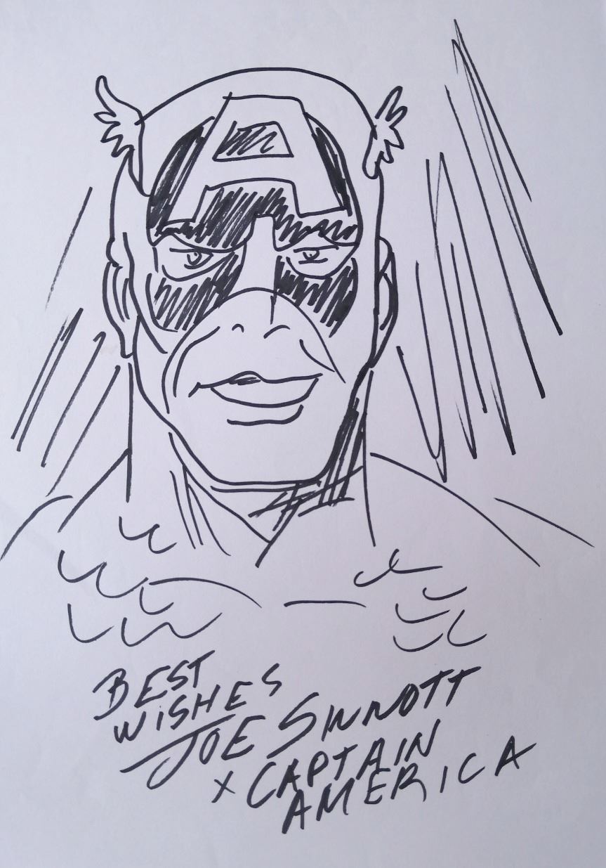A drawing on A4 card of Captain America by Marvel Comics' Fantastic Four comic artist Joe Sinnott.