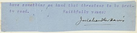 (1848-1908) American author remembered for his enduring creations, Uncle Remus and Brer Rabbit. Bold signature taken from a letter, mounted. Very good.