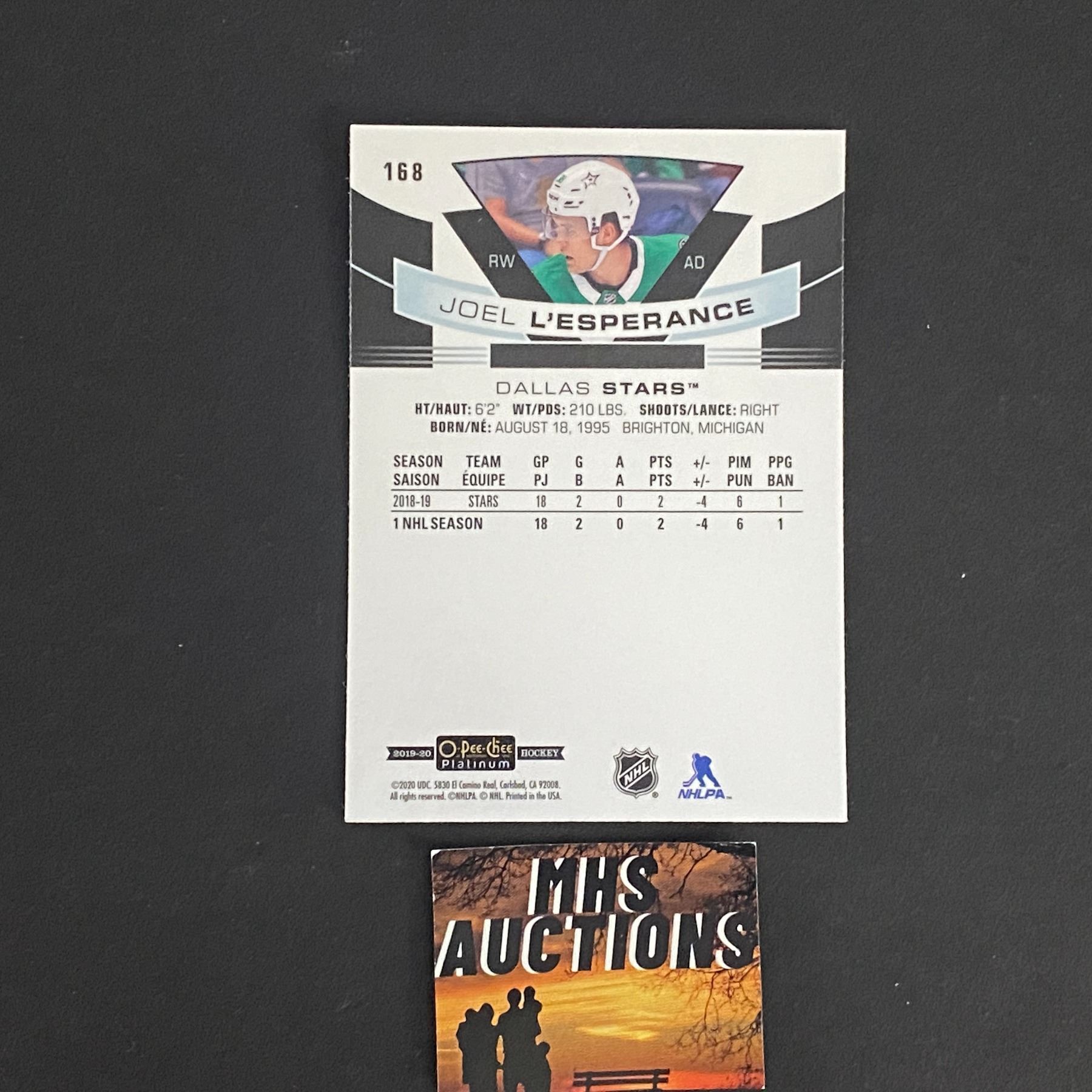 JOEL L'ESPERANCE 2019-20 O-PEE-CHEE PLATINUM MARQUEE ROOKIE CARD