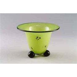 JOHANN LÖTZ WITWE, Klostermühle Hans Bolek Vase, farbloses Glas mit hellgrünem Innenüberfang und schwarzer floraler Bemalung. Glockige Form auf drei dunkelvioletten Kugelfüßen. H.: 9.8 cm. Unbezeichnet. Um 1915