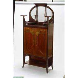 JOHANN ROTH, Coblenz Schrank, mahagonifarben gebeiztes Obstholz. Zweitürige Form, Türen mit geschwungen Füllungen und großflächigen linear geschwungenen Messingbeschlägen, Korpus oberhalb von ovalem, geschwungen gerahmtem Facette-Spiegel begrenzt, darüber kleine querrechteckige Ablage auf zwei gewellten Streben, unterhalb seitlich zwei gerundete Ablagen, an den vorderen Ecken zwei kleine quadratische Konsolen, am unteren Rand offenes Fach, geschwungene Beine. Innenausstattung mit Eschenfurnier.180 x 76 x 36 cm. In der rechten Tür innen oben mit Messingetikett bez.: Möbel-Dekoration/ JOH. ROTH, COBLENZ/ Gegründet 1846. Um 1905