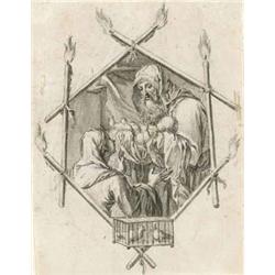 Die Darbietung im Tempel. Darstellung in unregelmäßigem Sechseck, eingefaßt von brennenden Fackeln, am unteren Rand ein Käfig mit Tauben. Tuschfeder- und -pinselzeichnung. - Größe: 10,3 x 8,1 cm. Schwach fleckig und mit geglätteten Knickspuren. Ränder etwas unregelmäßig, mit kleinen Fehlstellen sowie am Oberrand aufgezogen. Baumgartner erhielt seine erste künstlerische Ausbildung als Hinterglasmaler in Salzburg. Seine wesentliche Entwicklung erfuhr er jedoch an der Akademie in Augsburg im Umkreis von J. B. Bergmüller und G. B. Götz. Die meisten seiner zahlreichen Zeichnungen können als Vorlagen zu Stichen für Andachtsbilder und Thesenblätter gelten, die er bevorzugt mit Rocaille-Ornamenten schmückte.