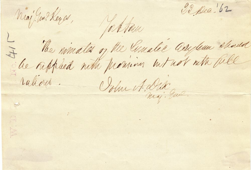 (1798 - 1879) Union major general most remembered for his threat to shoot anyone hauling down the American flag, and his suppression of the bloody New York draft riots. War-date A.D.S., 1p. oblong 8vo., Yorktown, Dec. 22 [1862], to Maj. Gen. Erasmus D. Keyes showing Dix's "compassionate" side": "...The inmates of the Lunatic Asylum should be supplied with prisoners'[?] but not with full rations...". Stamp docket, very good.
