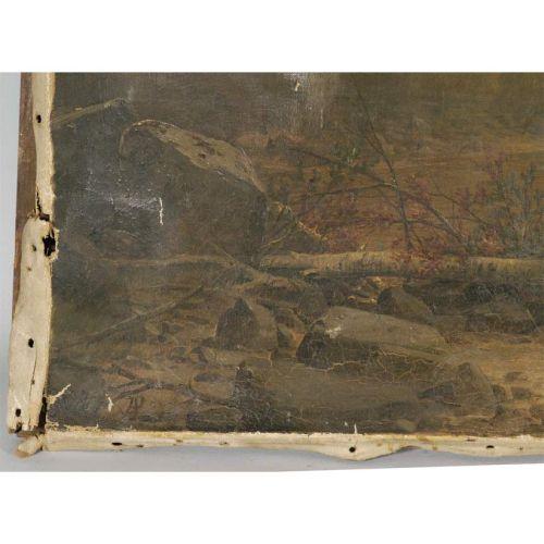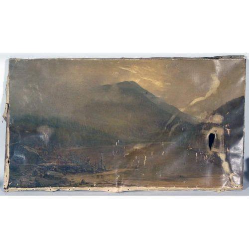 JOHN ADAMS PARKER 22"x40" oil on canvas View of Lake George signed with monogram lower left, as found condition CONDITION REPORT: largely pulled away from stretcher with a 3" tear (all canvas is present), paint loss from flaking in about 5% and blooming from water stains through about 50% of surface, crazing, dirty.