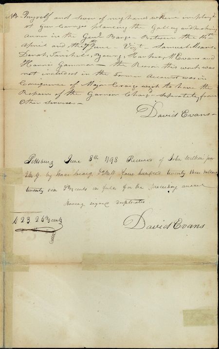 Fascinating D.S. 2pp. legal folio, [Washington, ca. June 8, 1798], an invoice submitted by shipwright and carpenter David Evans and headed: "The United States to David Evans". Evans bills the federal government: "...For Sundry Carpenter work at fitting up Boats for the Commander in Chief's family and stores - Also Boats for the Paymaster general and Store Boats - Making Gun Carriages Rammers and Spunges Compleat...smoothing the bottom of the Adams Galley...making [?] in the Commander in Chief's Barge &c....". There follows a list of 16 names (including Evans) with amounts due to each for up to thirty days' labor, with Evans signing twice at conclusion and finally being paid off in Pittsburg. A few marginal archival tape repairs on second page, else very good. Adams was likely preparing for anticipated hostilities against France and the likelihood that the French would attack Washington. Increased depredations by privateers from Revolutionary France required the U.S. Navy to protect the expanding American merchant shipping fleet, leading to the Quasi-War which would commence a month later.