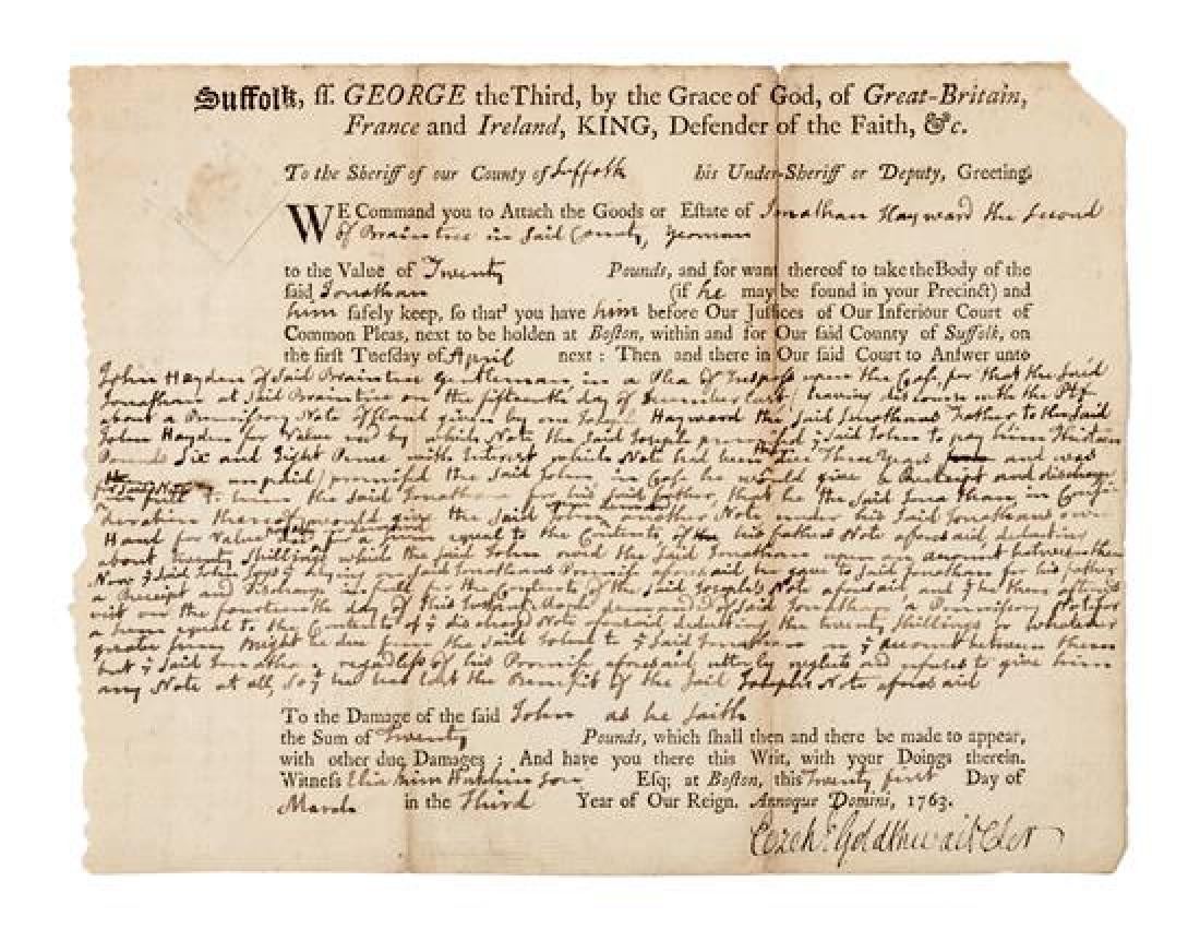 John Adams (1735-1826). Partly printed document acomplished in Adams's holograph manuscript and signed ("Adams") in corner on verso. Boston, 21 March 1763.