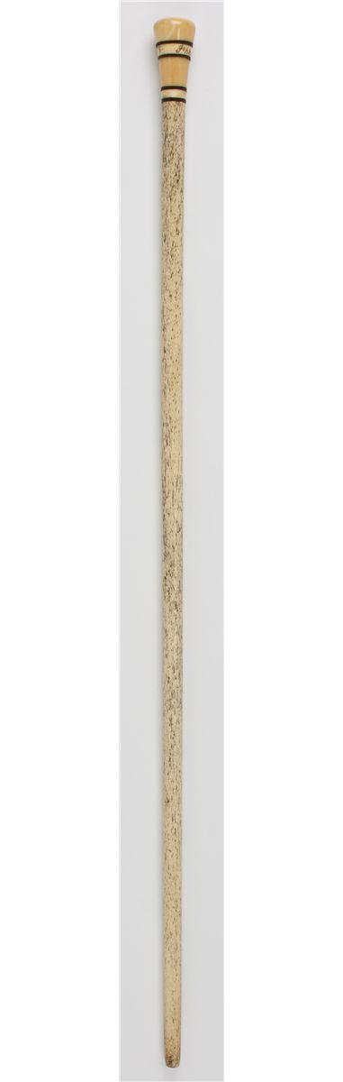 A curious piece, a 34" bone walking stick with what appears to be an ivory knob at top, the ivory bearing several separating disks of an unknown brown material, possibly a hardwood. About the handle appears hand-engraved lettering: "John Adams 1775". An estate piece and unreserved - and that is about all we know about it. Possibly a "sleeper" and perhaps worthy of further investigation.