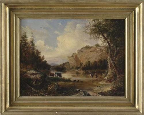 JOHN AMORY CODMAN (American, 1824-1886) NEW HAMPSHIRE LAKE SCENE. Oil on canvas scene shows two figures knee deep in water. One with bundle of sticks, the other with basket on head, walking across water to a group of four cows. Large trees and rocky shoreline. A rock cliff is seen in background beyond the lake. Birds fly against a cloud and blue sky. Signed lower right "JA Codman". Housed in a wide deep lemon gold antique frame. White chalk mark on back might indicate title of Echo Lake. SIZE: 18-1/4" x 24-1/4". CONDITION: Some inpainting, mostly in sky. Very good. 9-27600