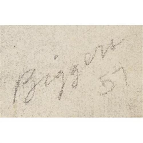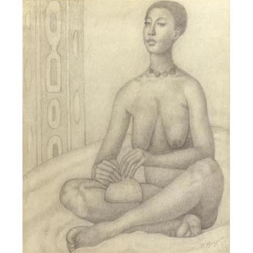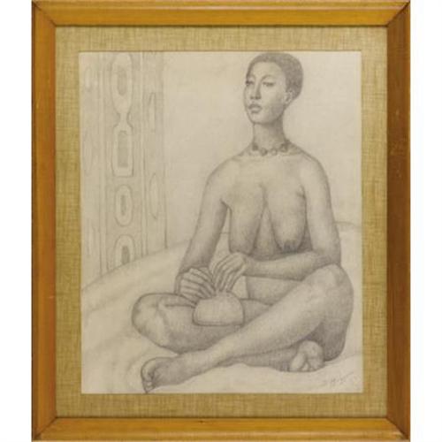 <B>JOHN BIGGERS (American, 1924-2001)</B></I><BR><I>Untitled</B></I>, 1957<BR>Graphite on paper<BR>22-1/2 x 18 inches (57.2 x 45.7 cm)<BR>Signed and dated lower right: <I>Biggers 57</B></I><BR> <BR>Among the first generation of university-trained African American artists, John Biggers is known for his murals, oils, graphic works, and prints. He was born in Gastonia, North Carolina, and studied at the Hampton Institute in Virginia. In 1943, while at Hampton, Biggers' mural, <I>Negro Soldier,</B></I> was included at the seminal exhibition, <I>Young Negro Art</B></I>, at the Museum of Modern Art in New York.<BR><BR>In 1949, he moved to Houston where he founded the art department at Texas Southern University. Up until this time it was almost impossible for young Negro artists to obtain formal training in fine arts. In 1950, Biggers won first prize at the Museum of Fine Arts, Houston, for his painting, <I>The Cradle.</B></I> In 1957, he traveled to Africa to explore his African heritage. He published a book based on his travels in Ghana, Nigeria, and other African countries.<B>Condition Report:</B> Excellent condition. Period frame in excellent condition.<BR><BR><b>Shipping:</b> Requires 3rd Party Shipping (<a target="_blank" href="http://www.heritageauctions.com/common/shipping.php">view shipping information</a>)