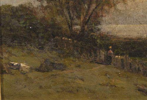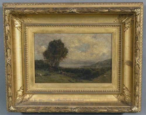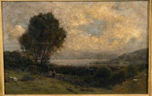 JOHN BUNYON BRISTOL, 8 3/8"x12 5/8" o/c, view over the Hudson River, signed ll, condition: attic found, crazing, 1/2" hole in center, very dirty, packing and shipping w/i continental USA $40 + insurance