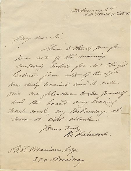 (1813 - 1890) "The Pathfinder", explorer of the western frontier and Union army major general until sacked by Lincoln for his efforts to garner more power. A.L.S. 1p. 8vo., New York, Feb. 4 [1861] thanking his correspondent for: "...enclosing tickets for Mr. [Cassius M.?] Clay's lecture...it will give me great pleasure to see yourself and the board any evening next week...". With engraving. Mounted, very good.